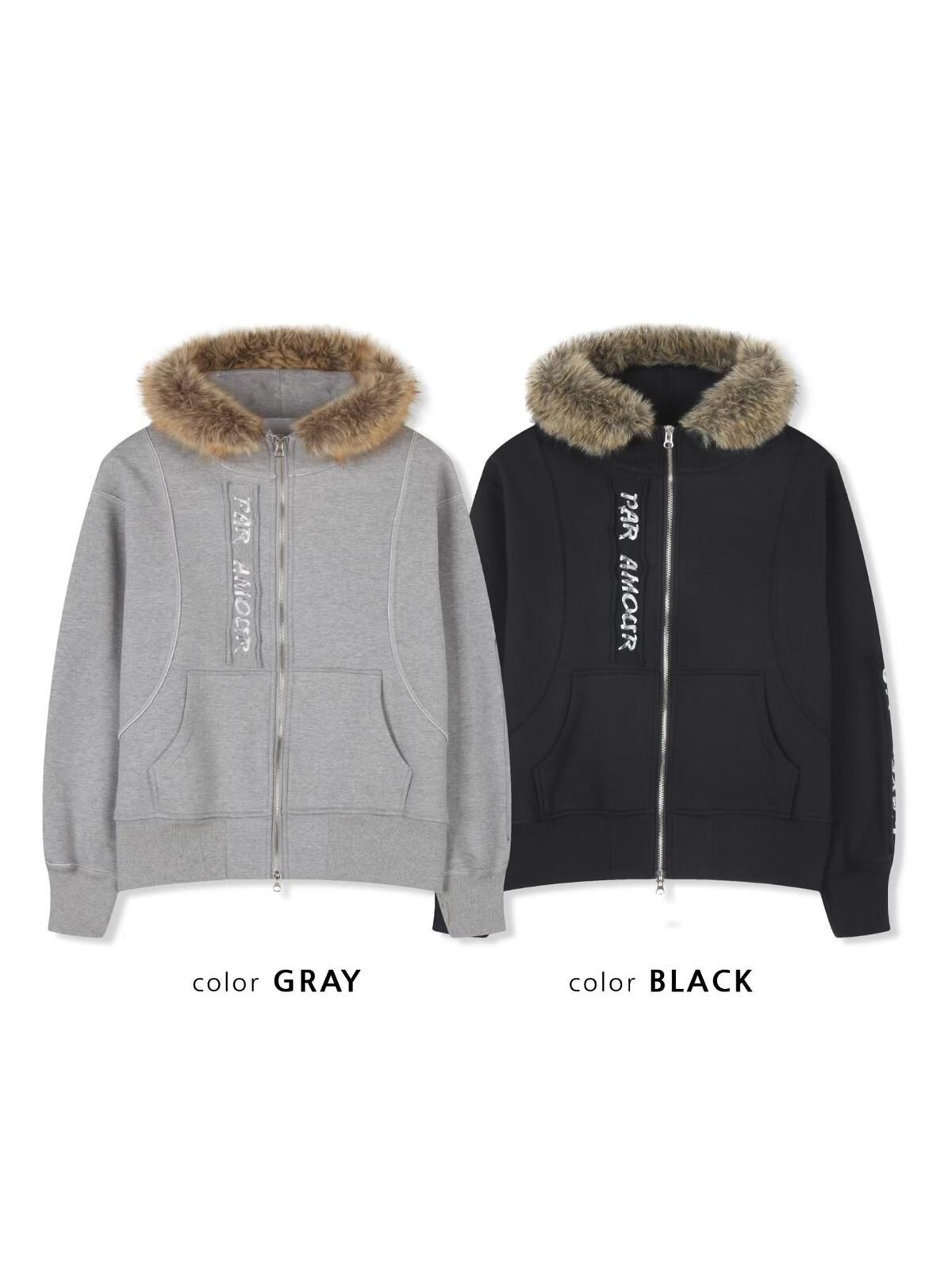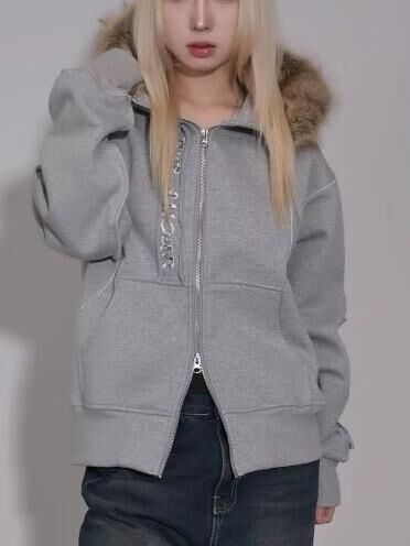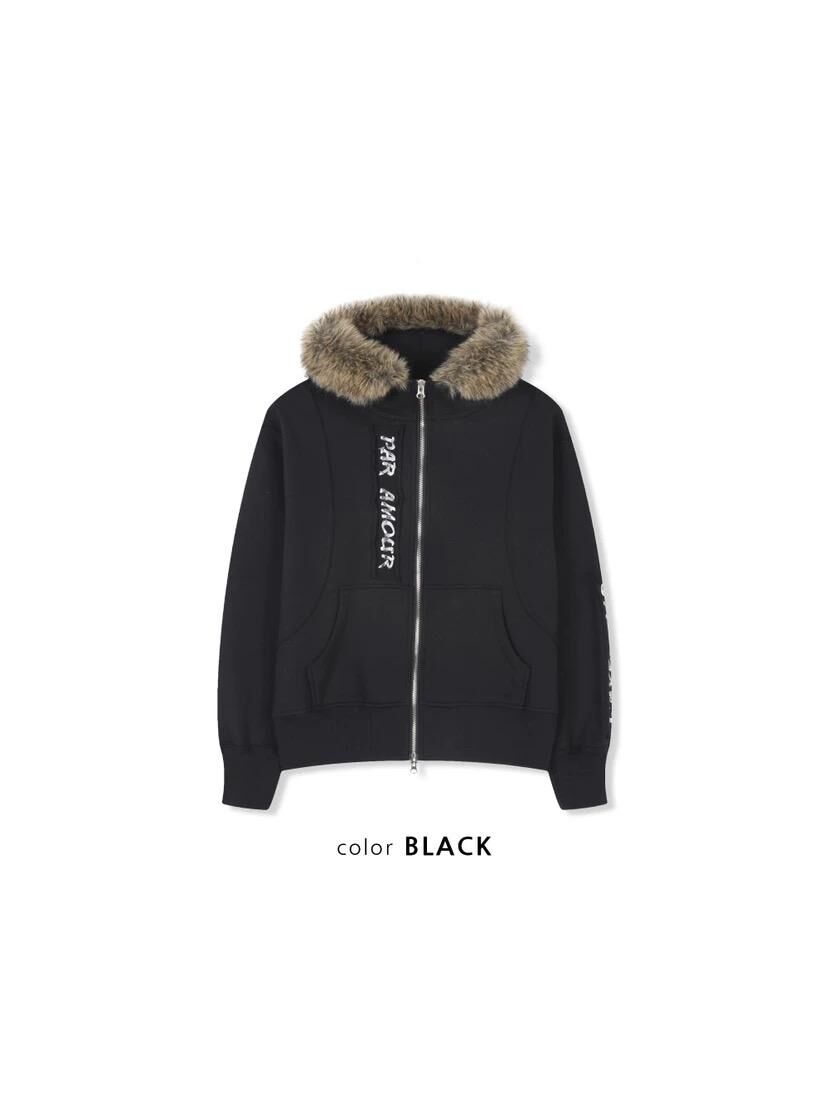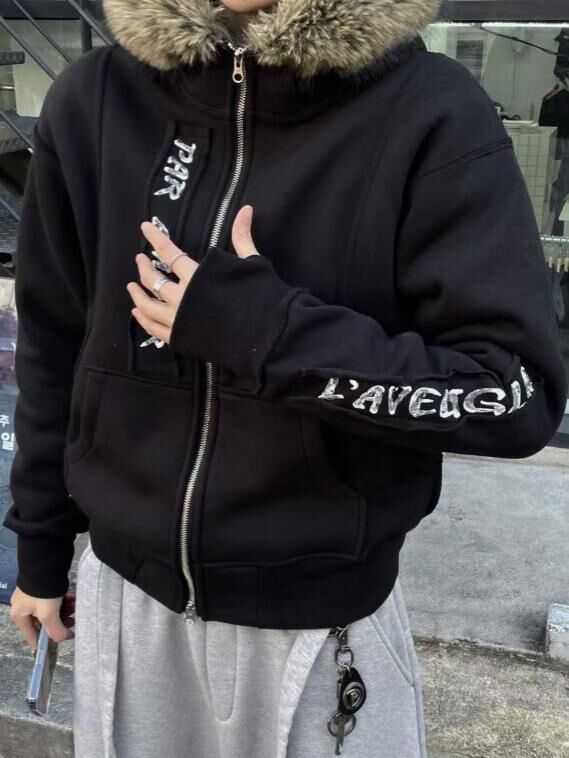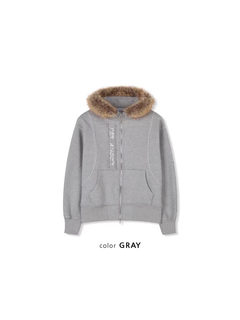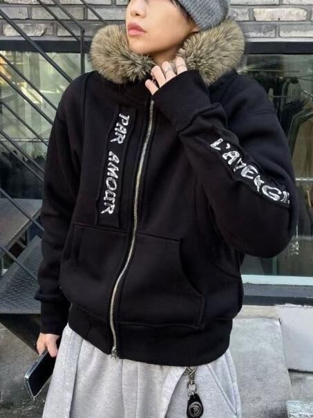 毛毛帽英文字拉鍊外套(薄抓毛底) APT-005JK