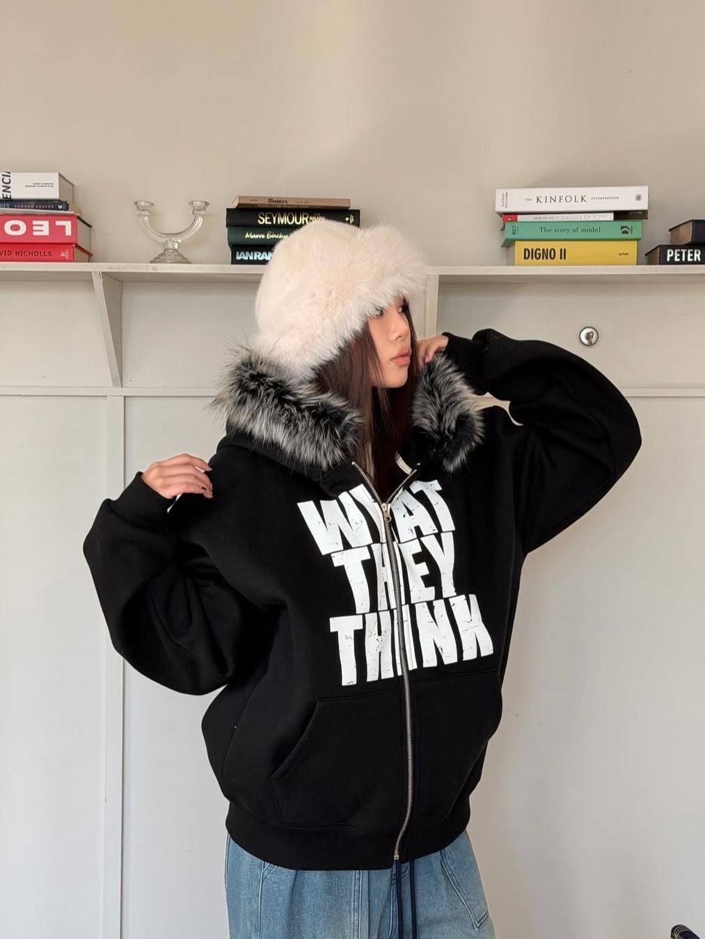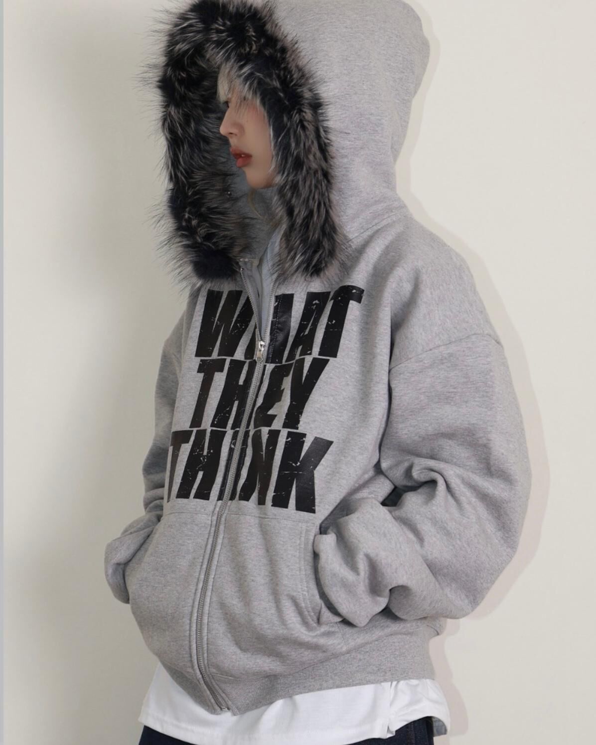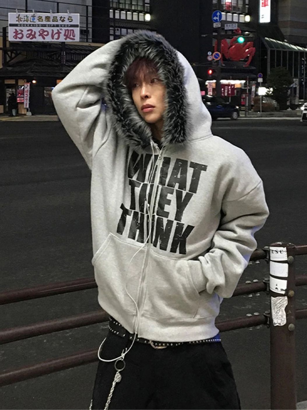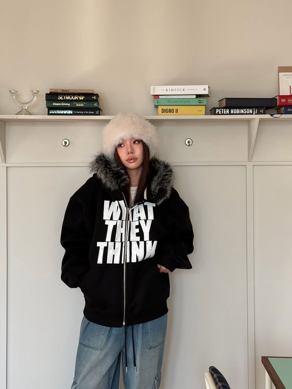 毛毛帽英文字拉鍊外套(毛可拆/薄抓毛底) BALLIN-007JK