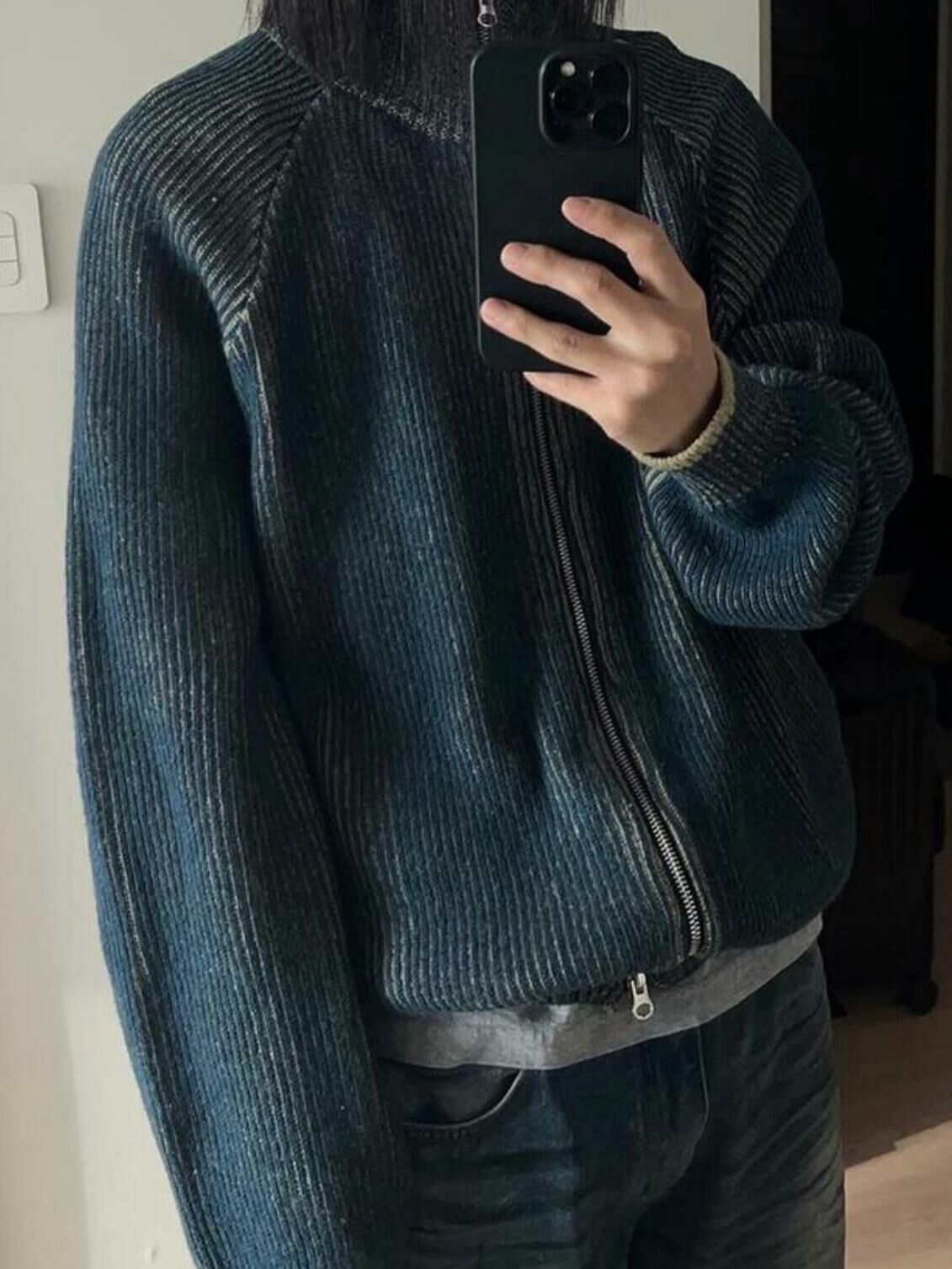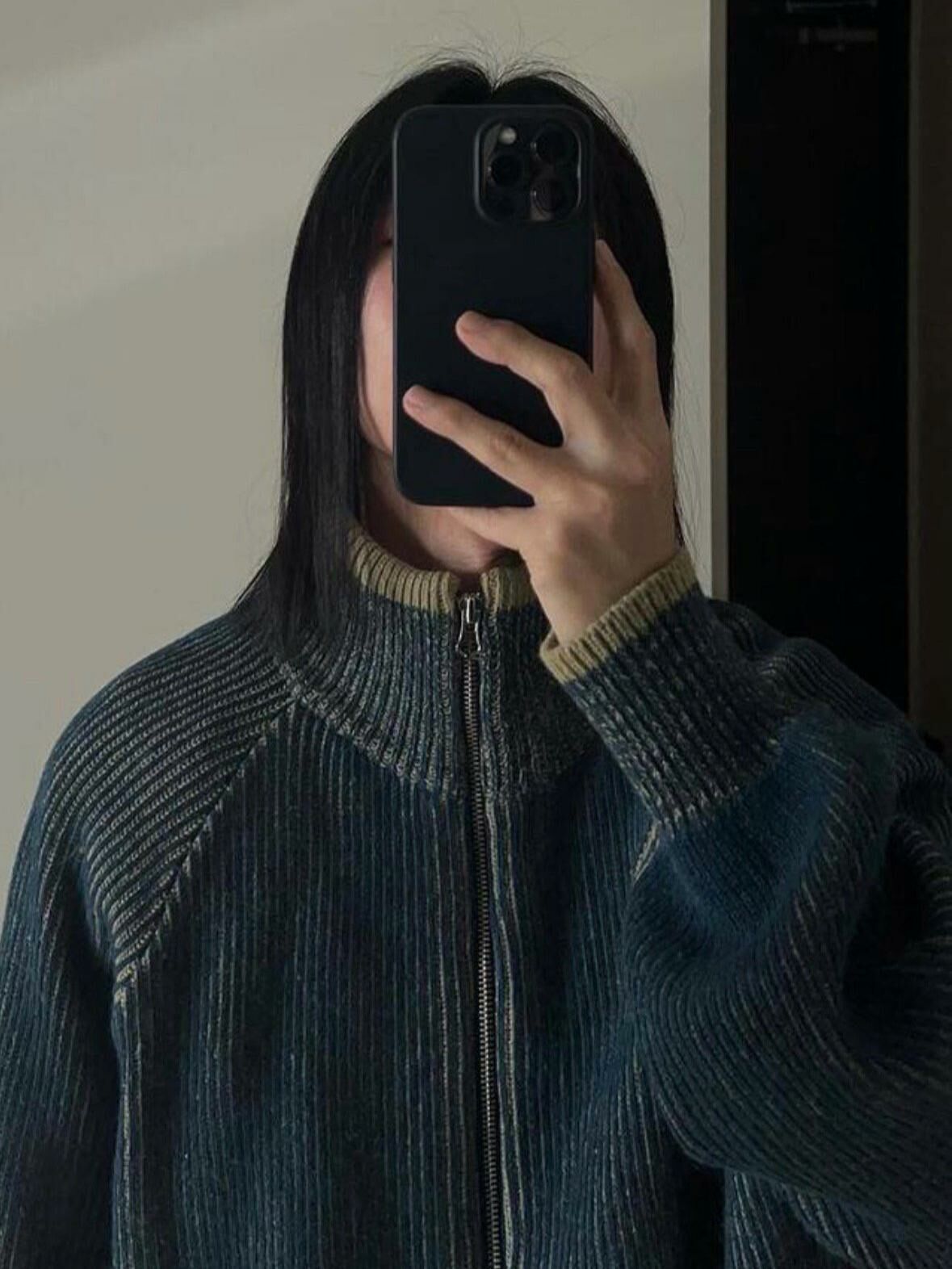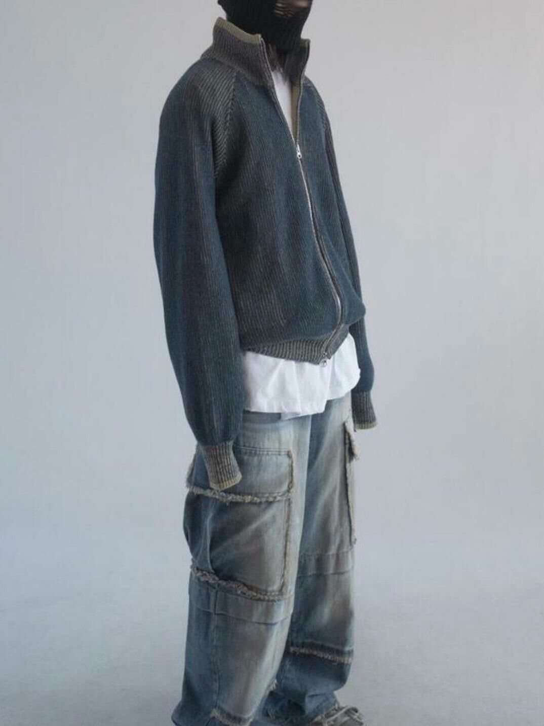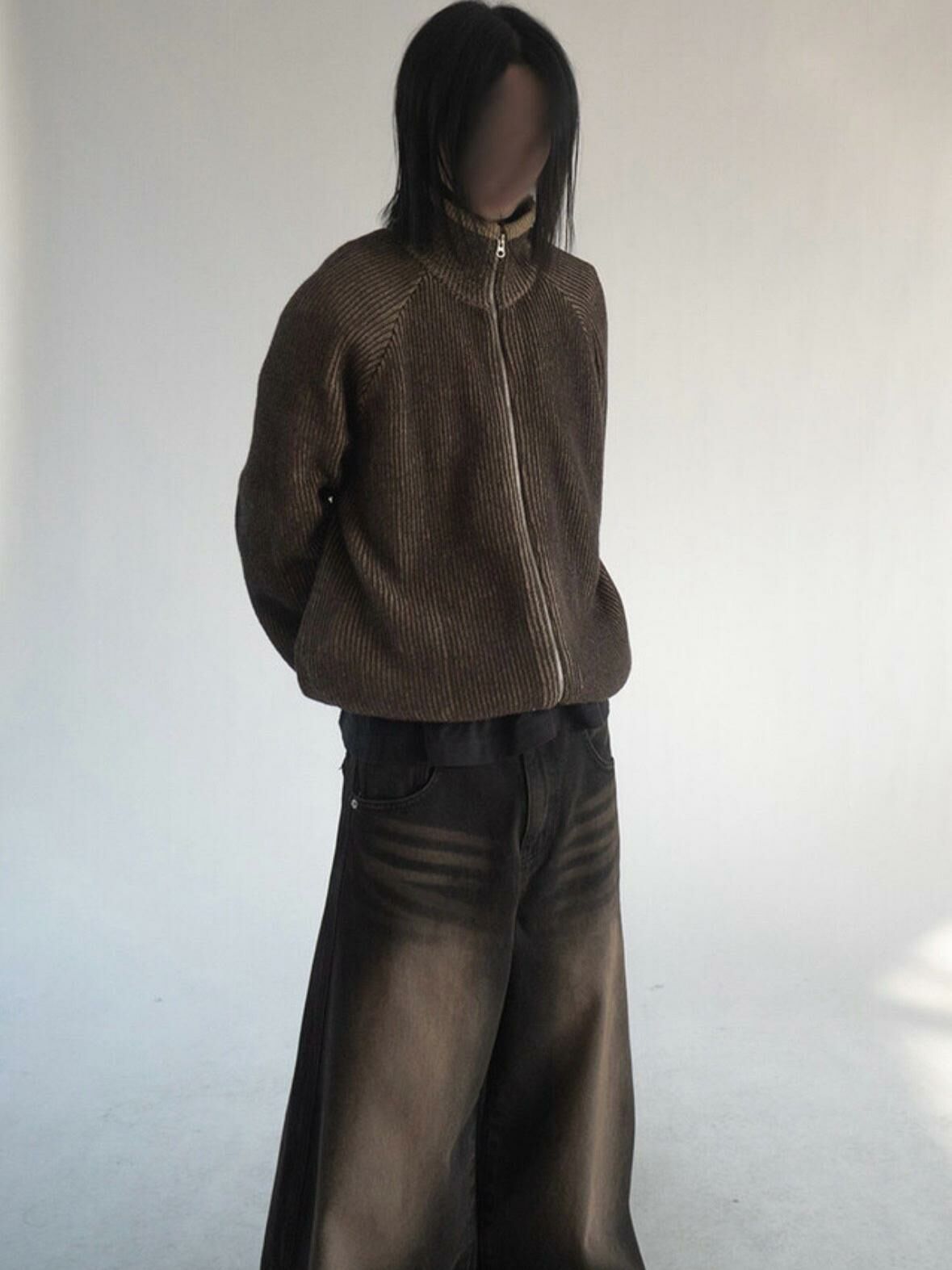 企領暗直紋拉鍊針織外套 DOT-072JK
