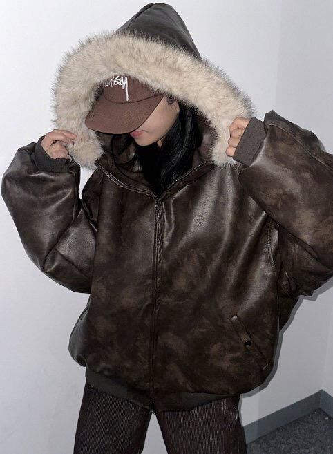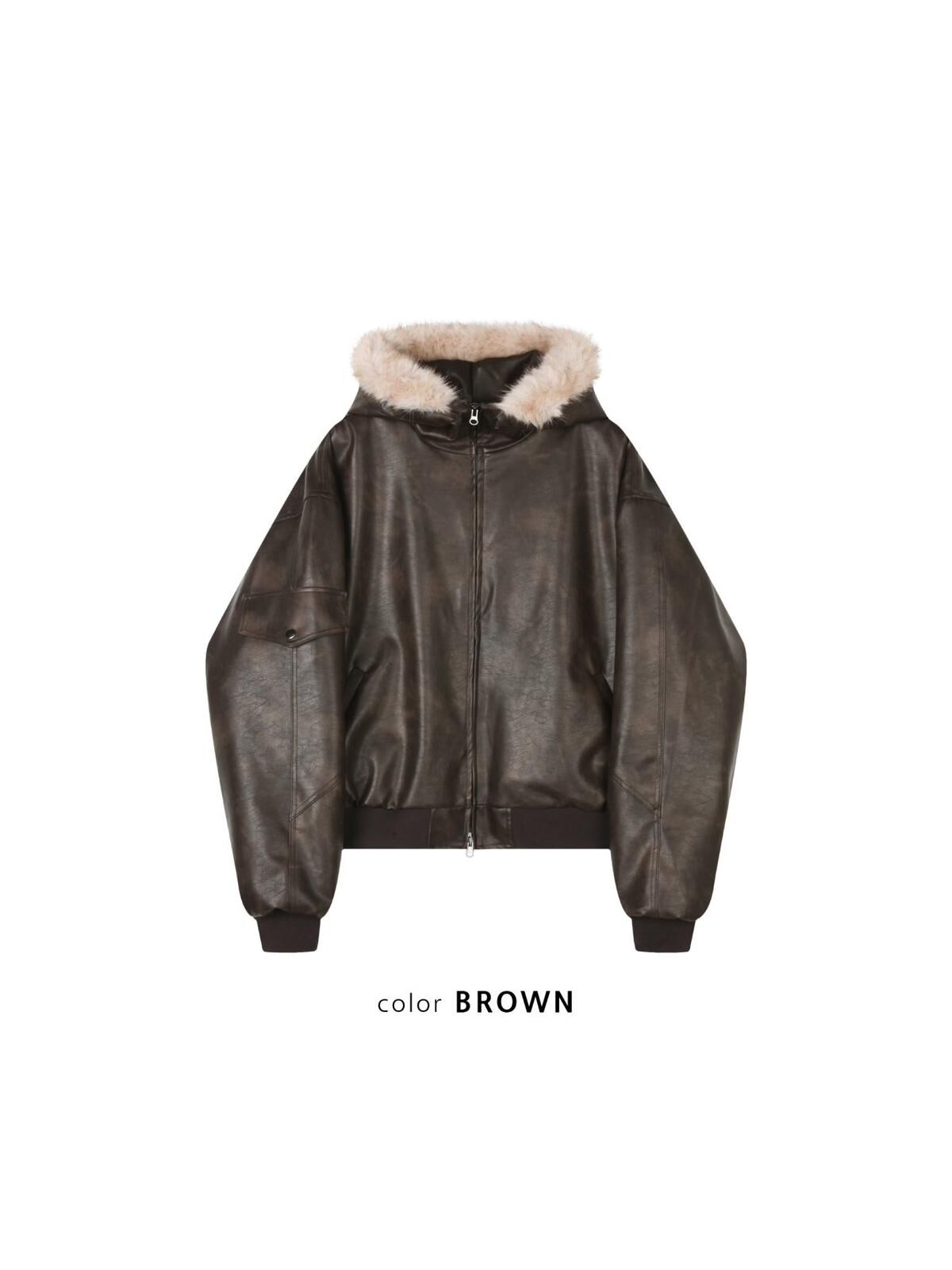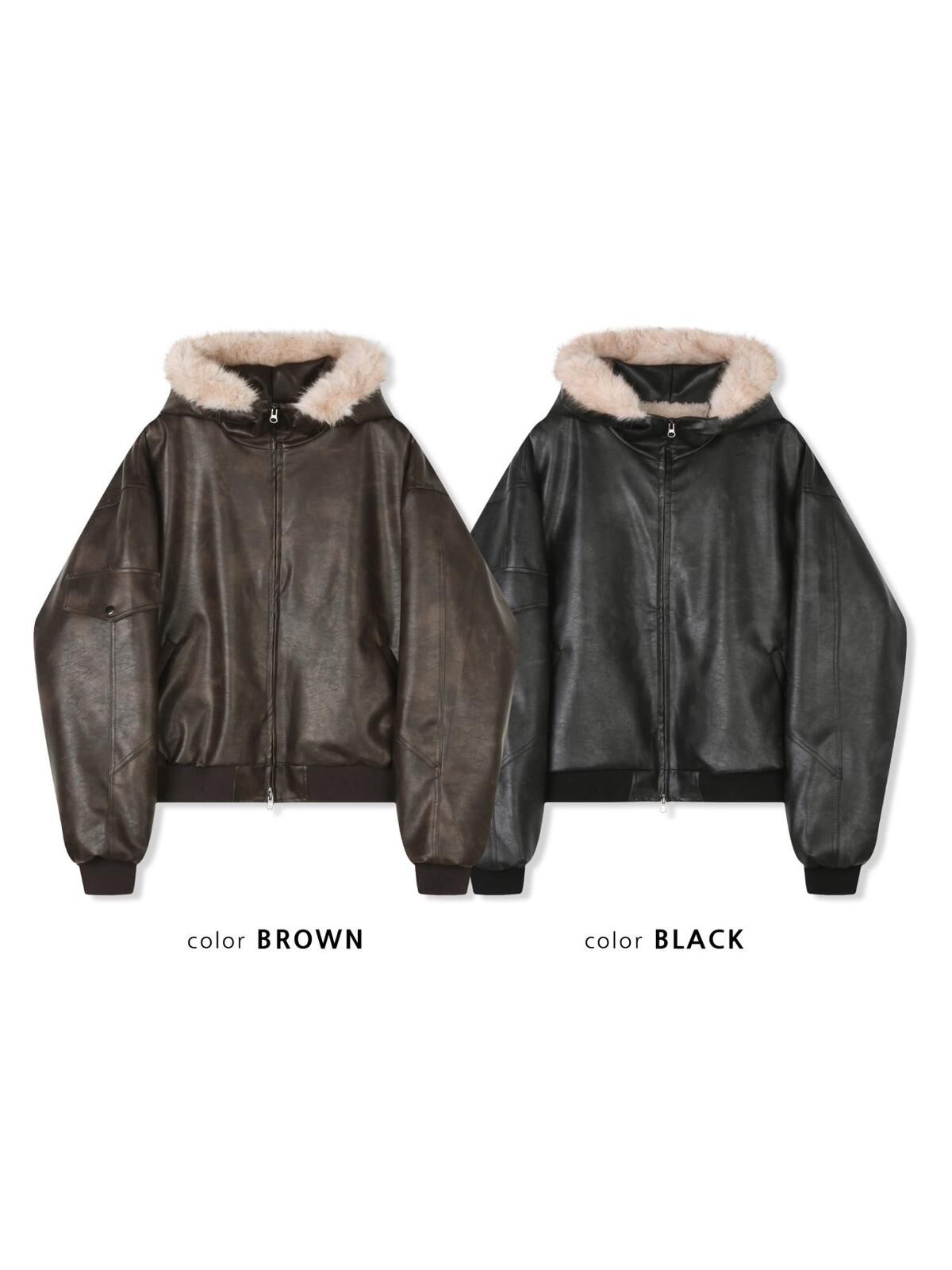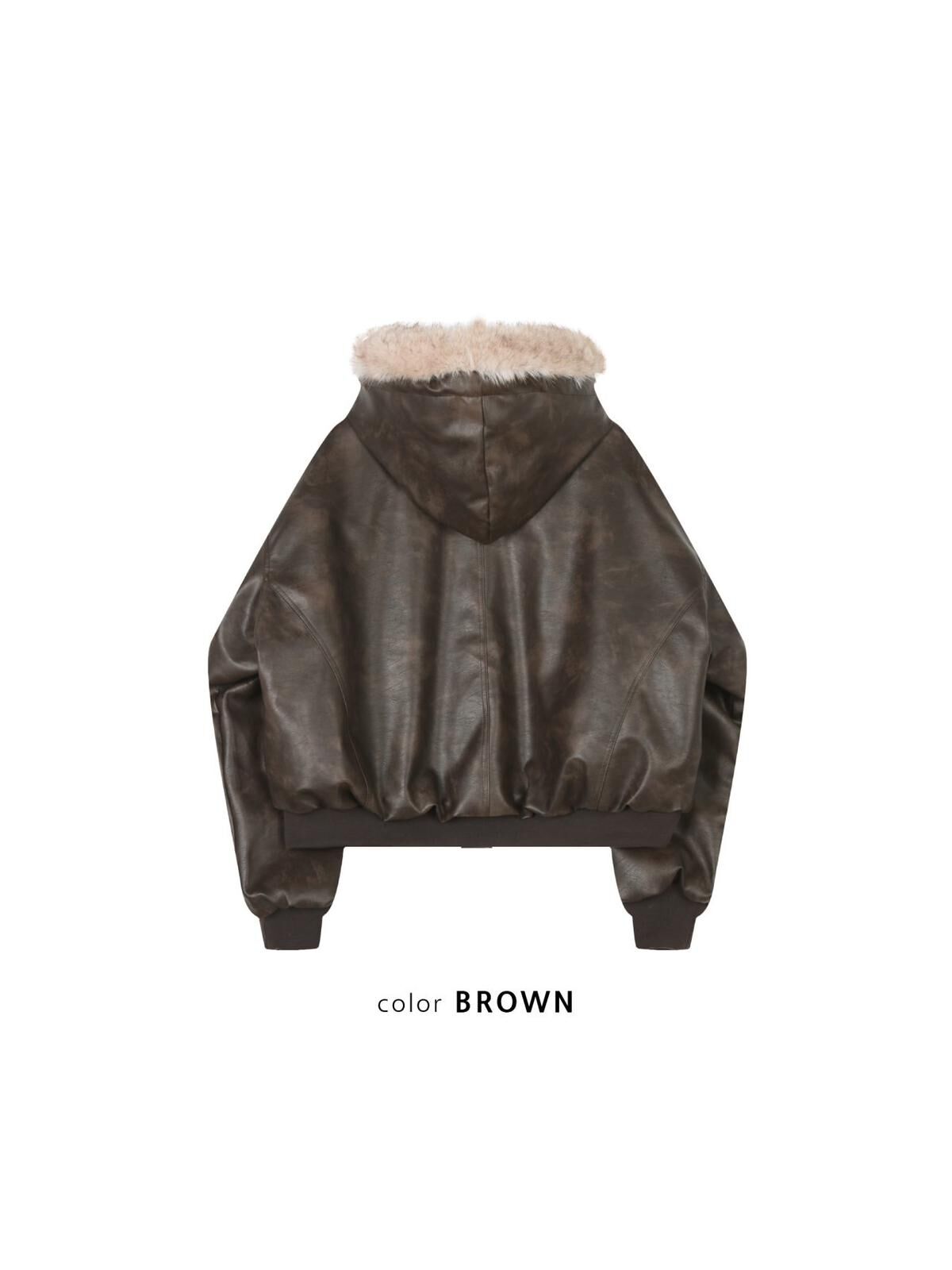 毛毛帽拉鍊合成皮褸 GATHER-052JK