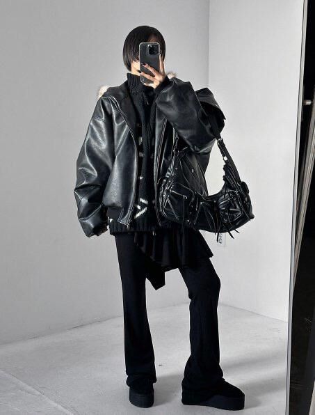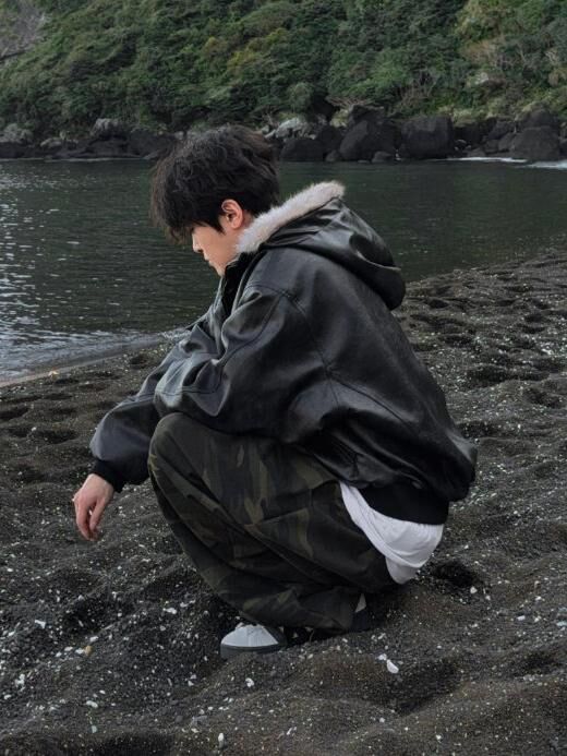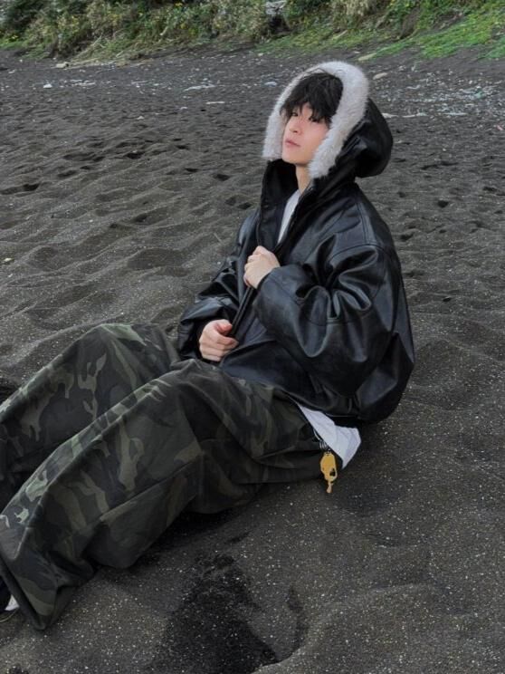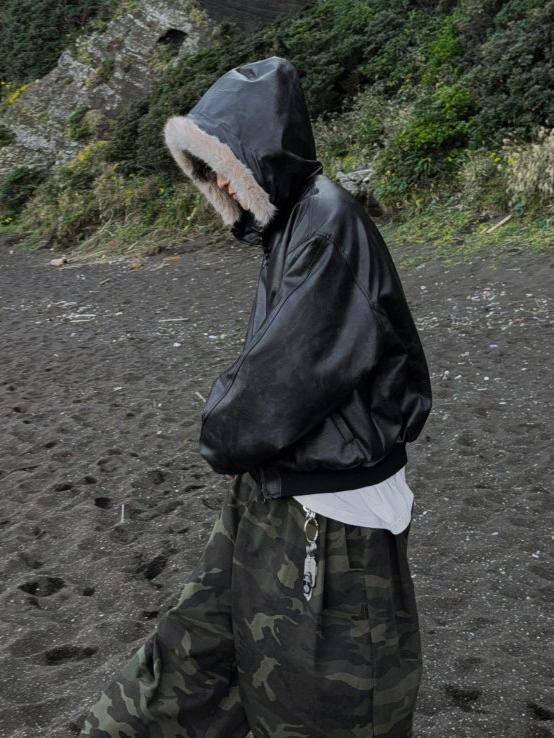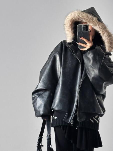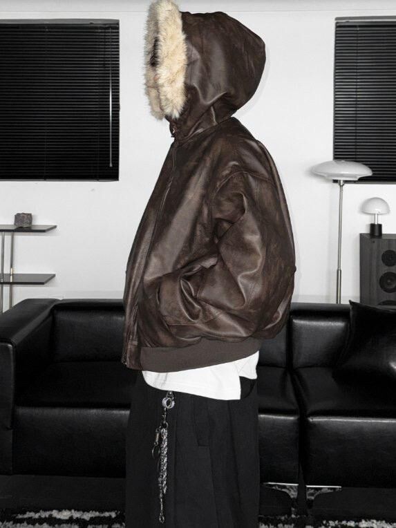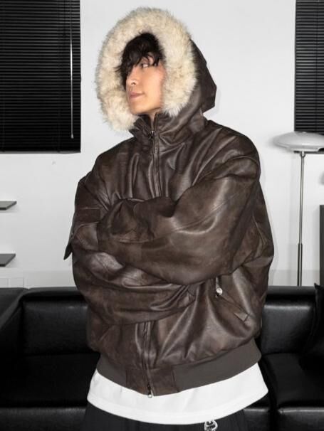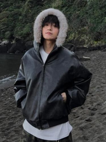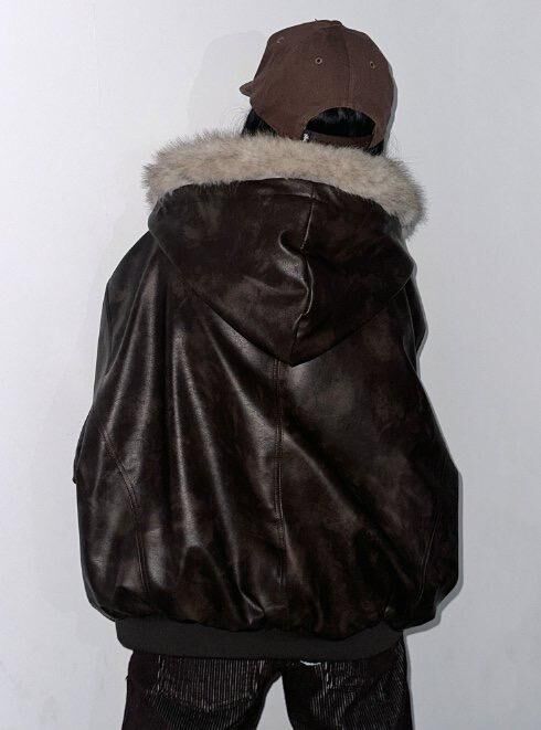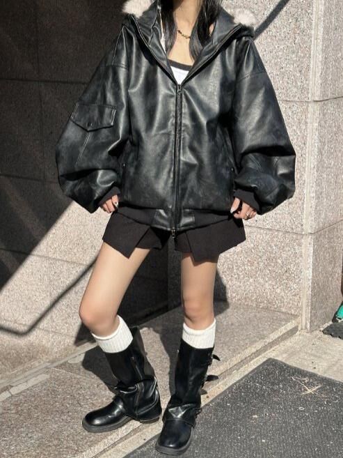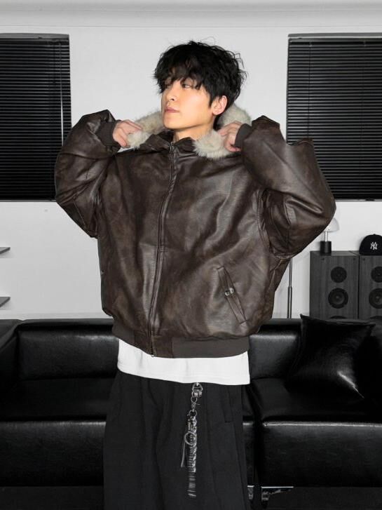 毛毛帽拉鍊合成皮褸 GATHER-052JK