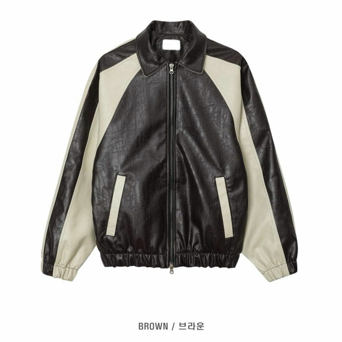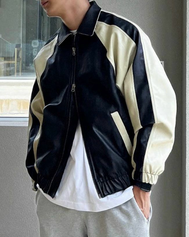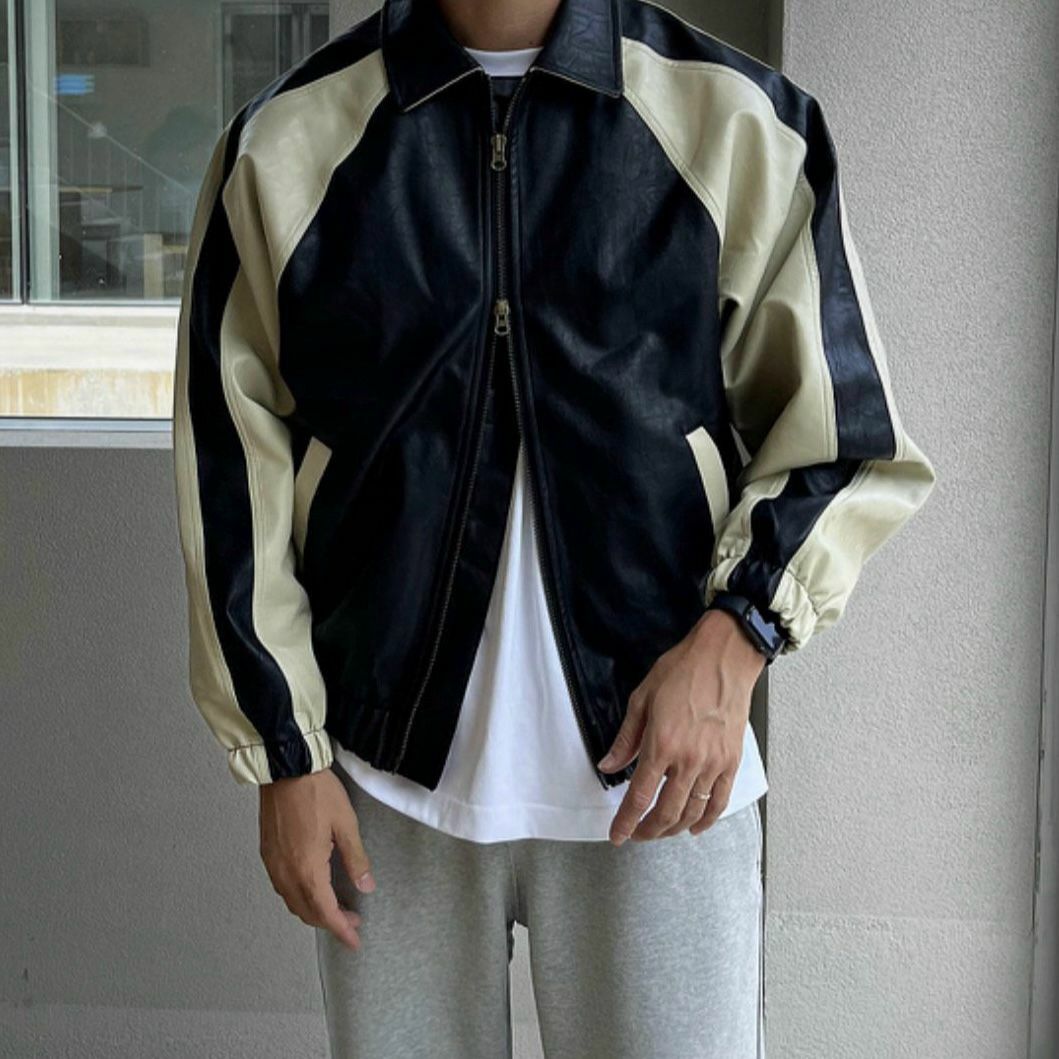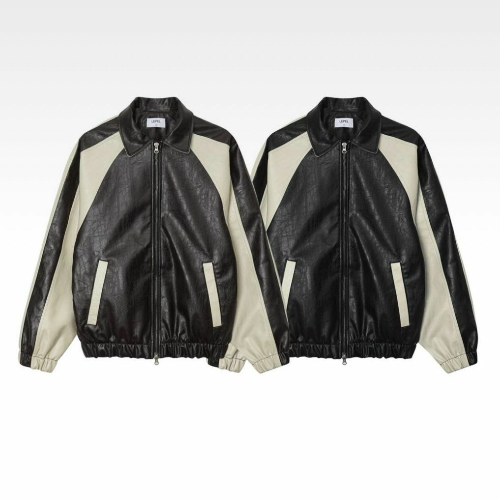 反領拼色拉鍊合成皮褸 JK2468