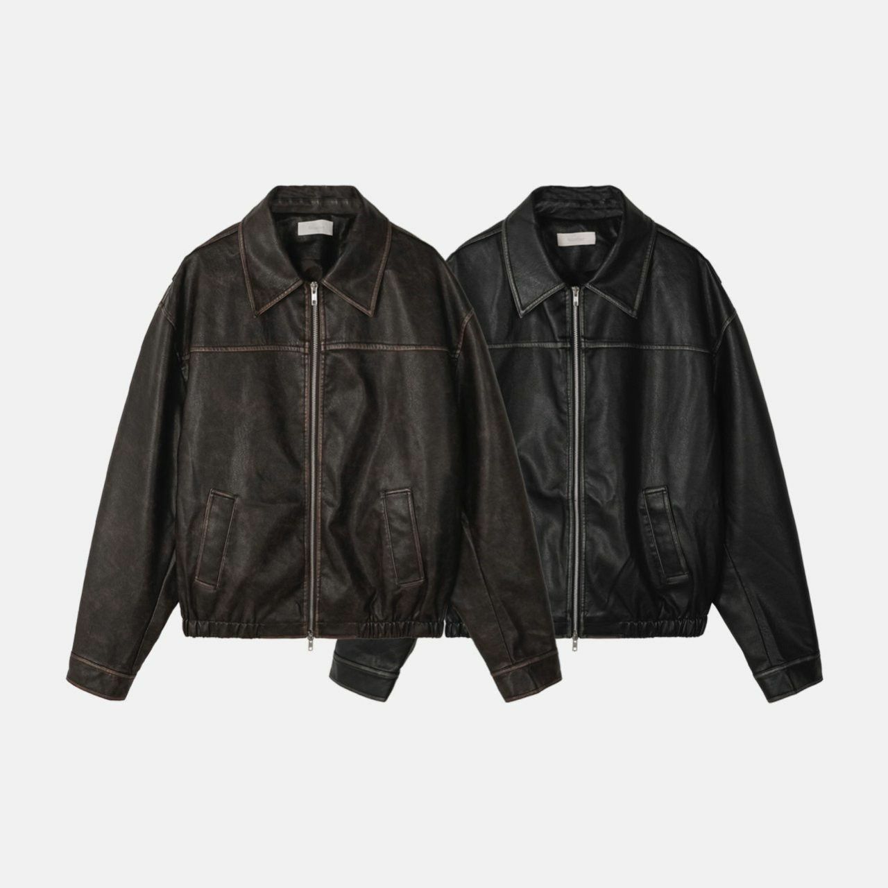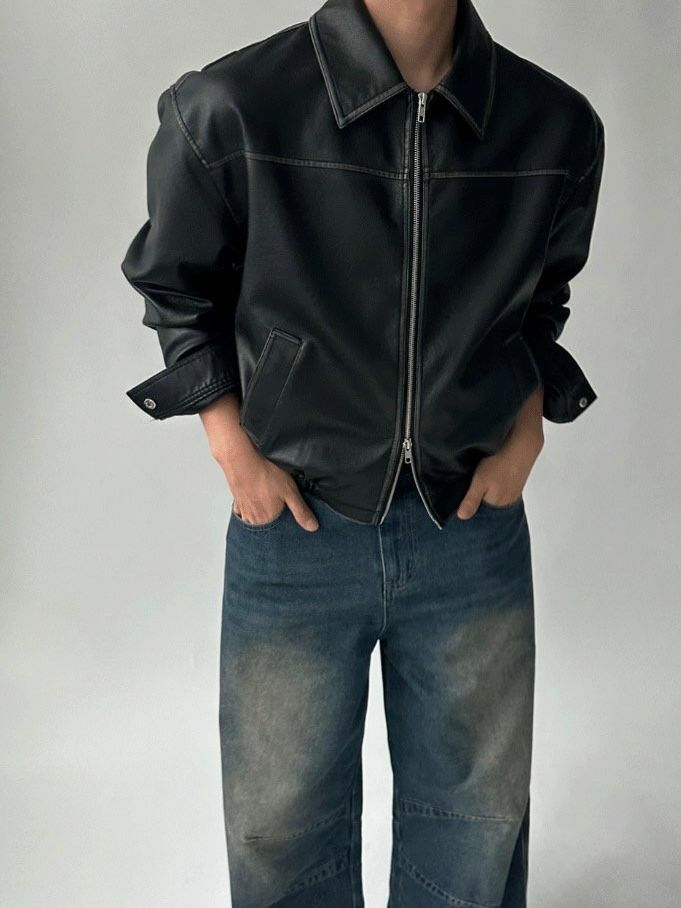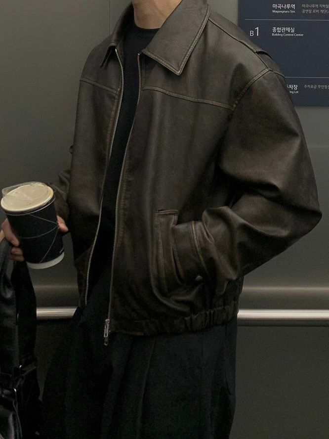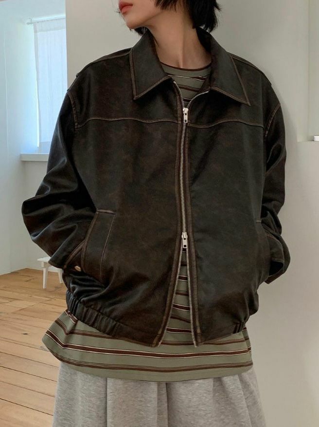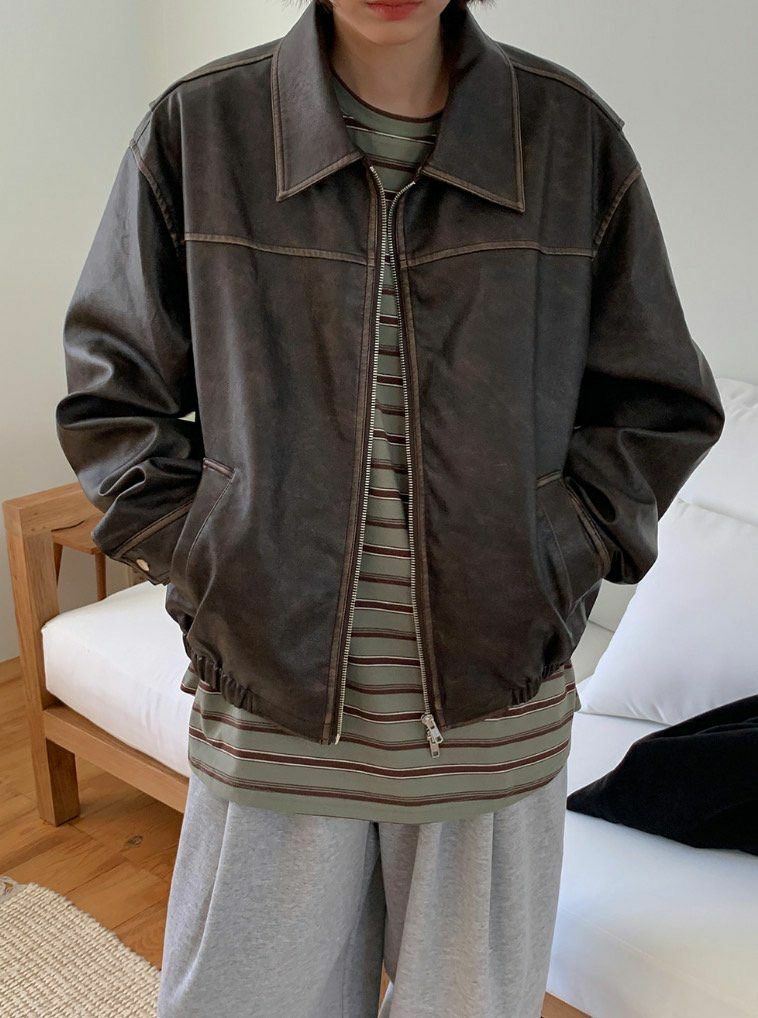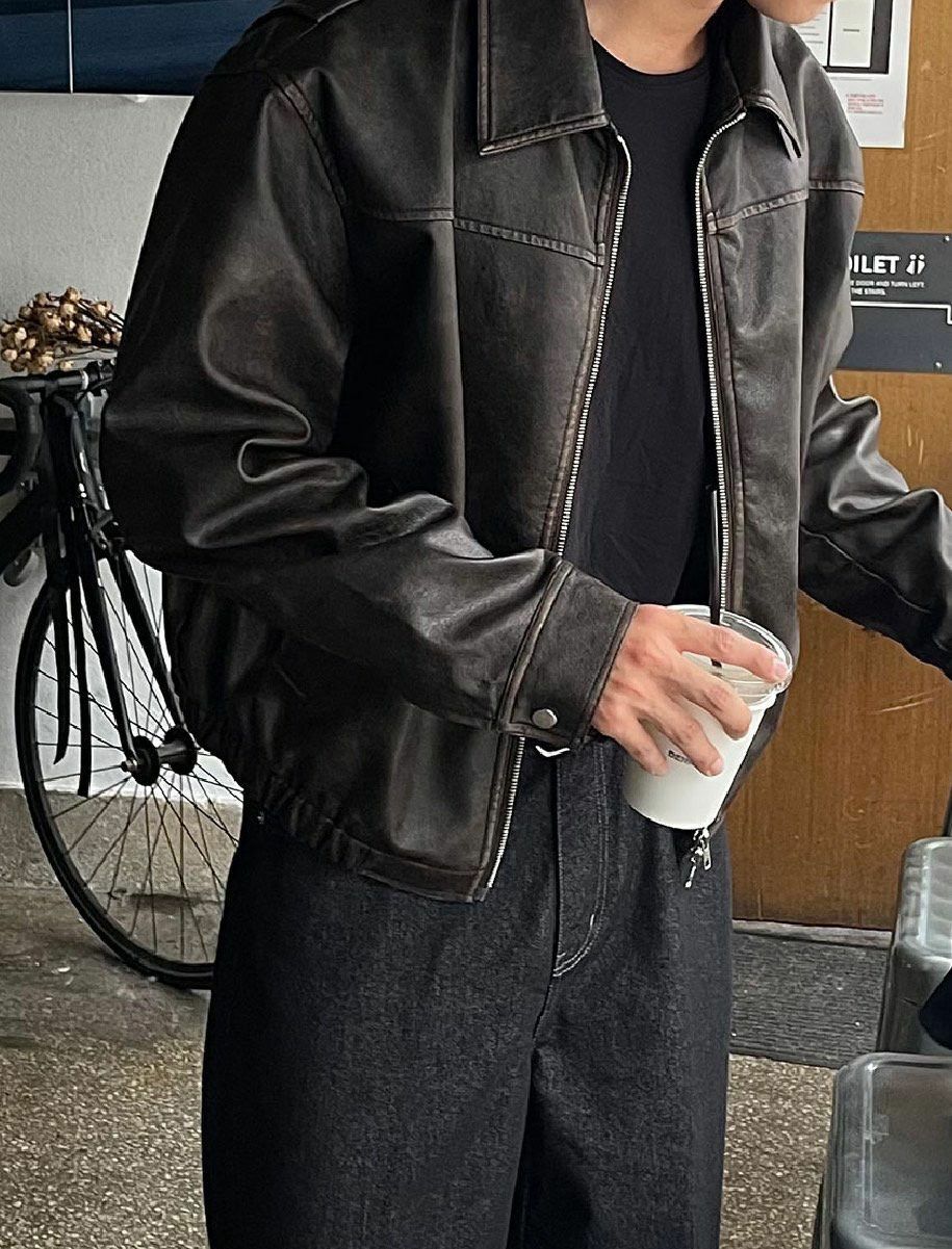洗水反領拉鍊合成皮褸 JK2560