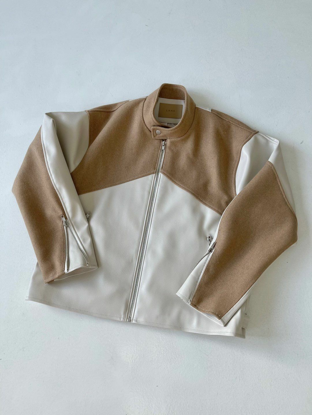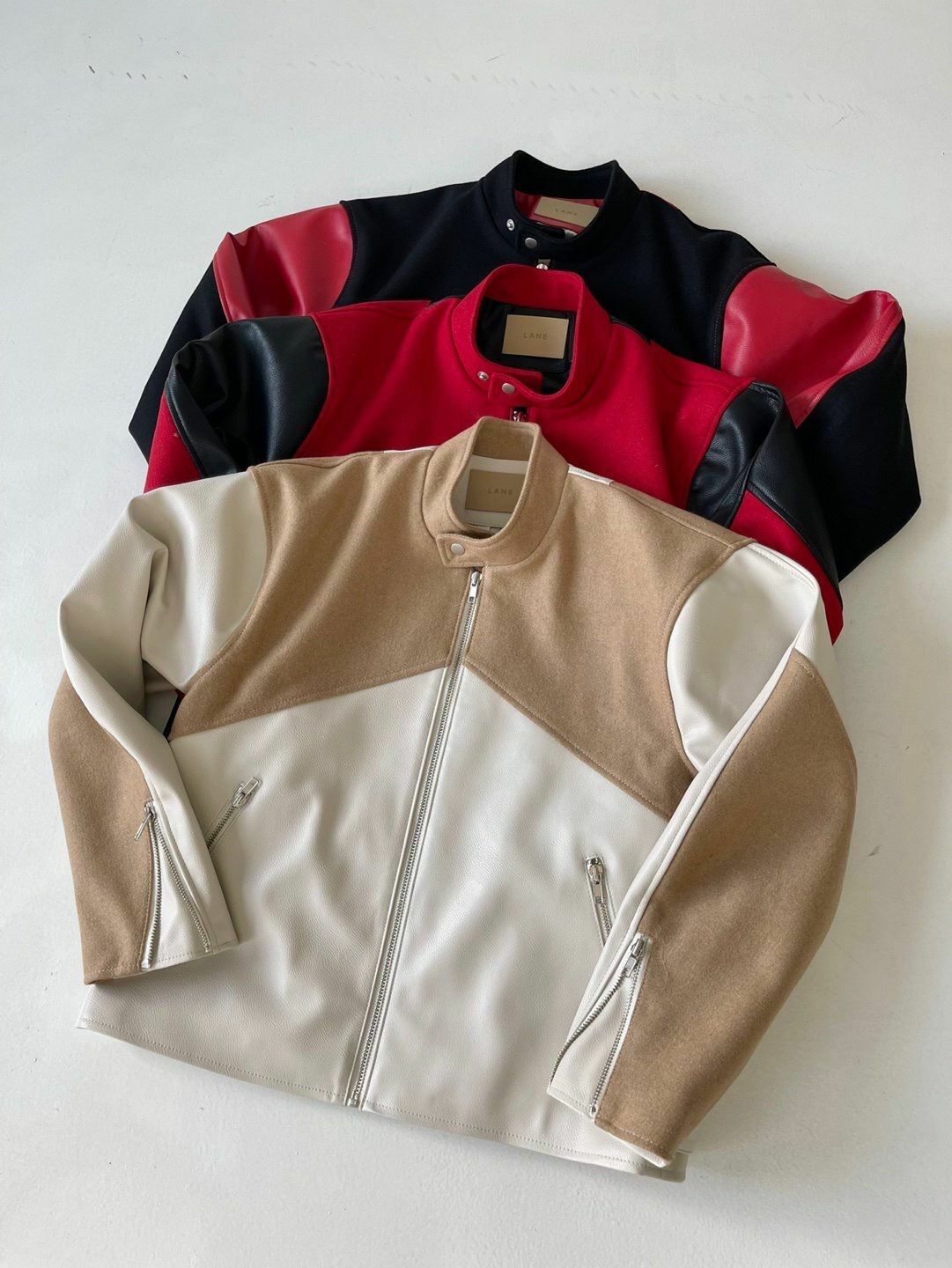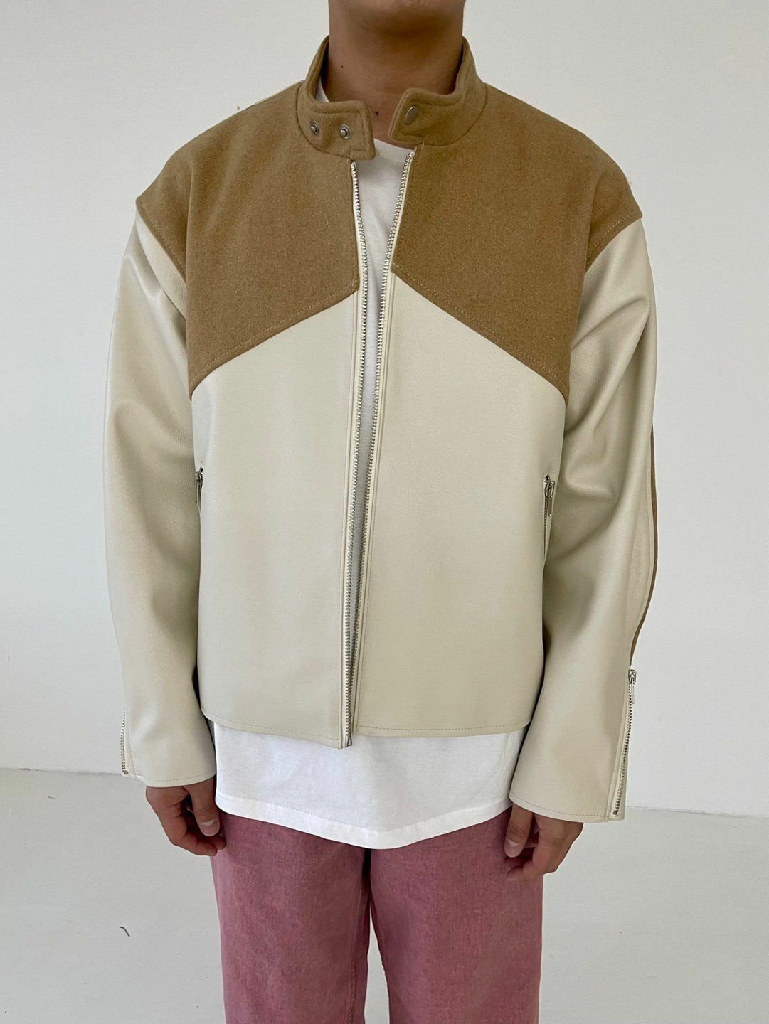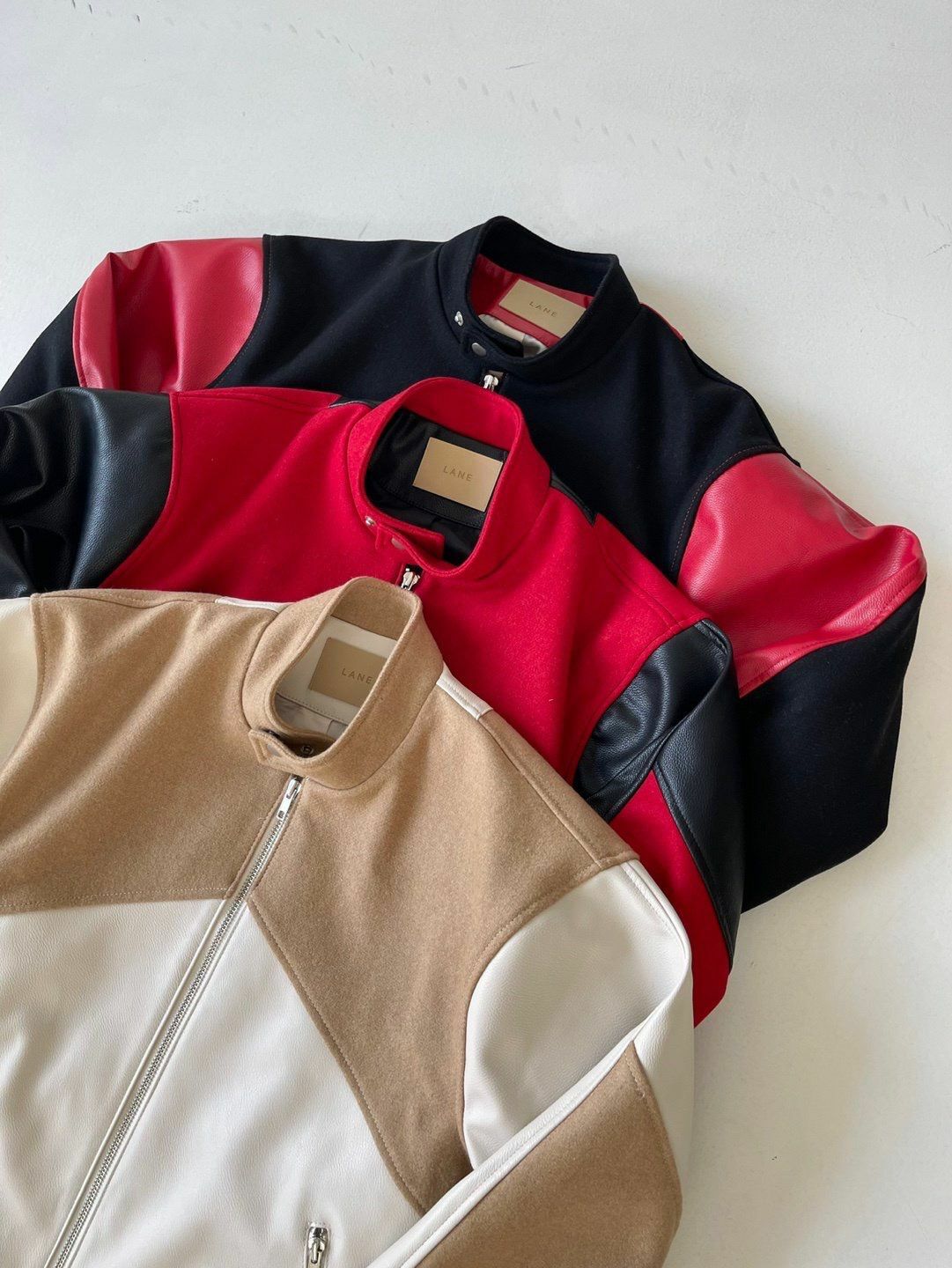 拼色企領拉鍊合成皮褸 LANE-062JK