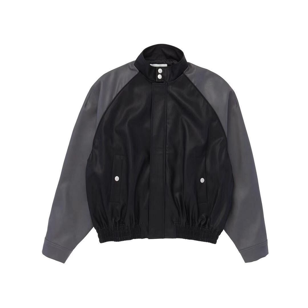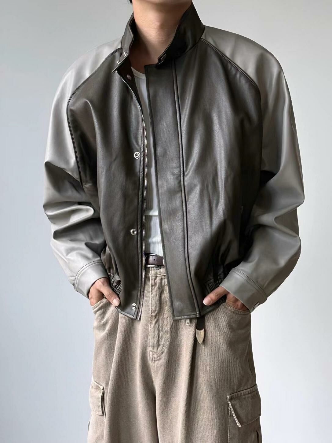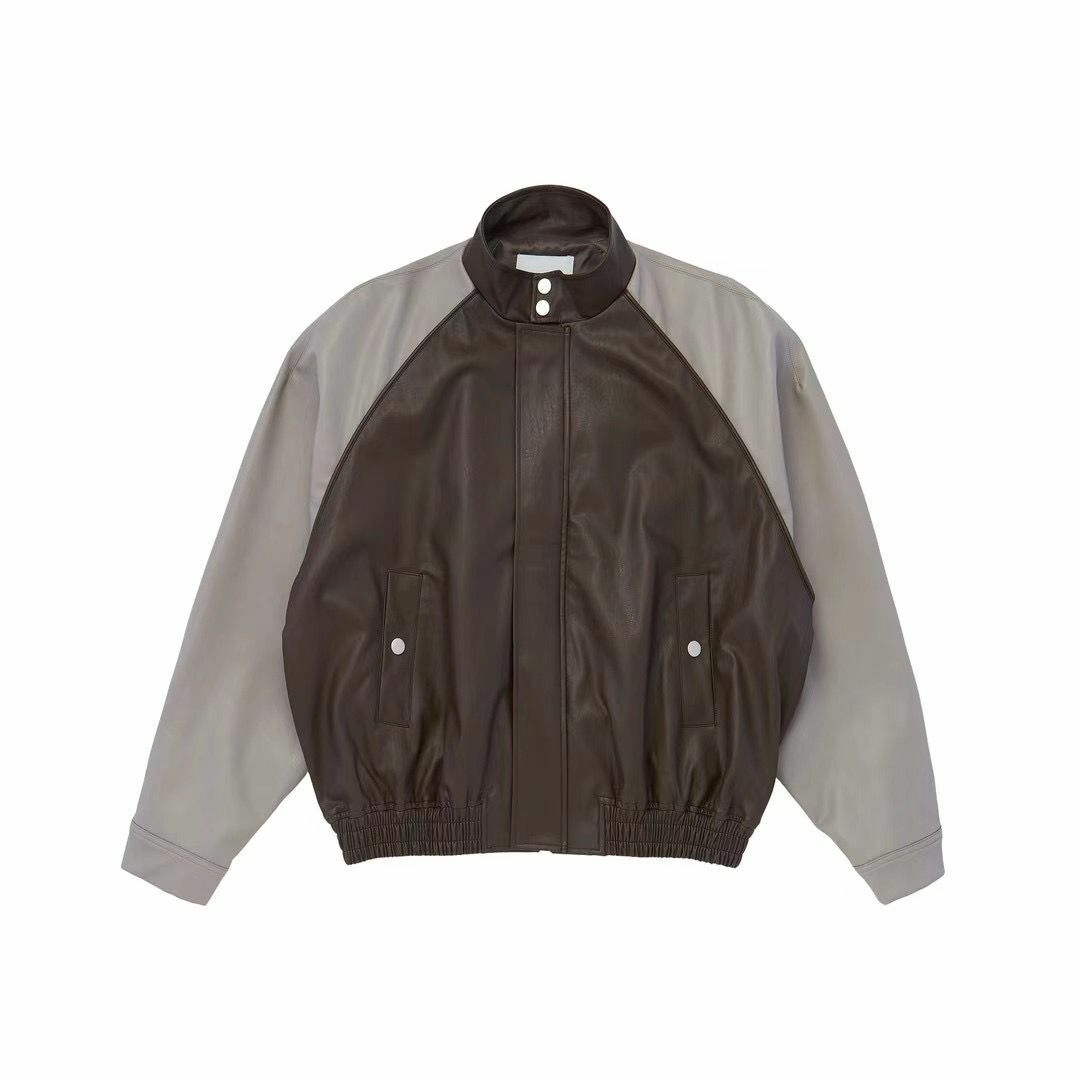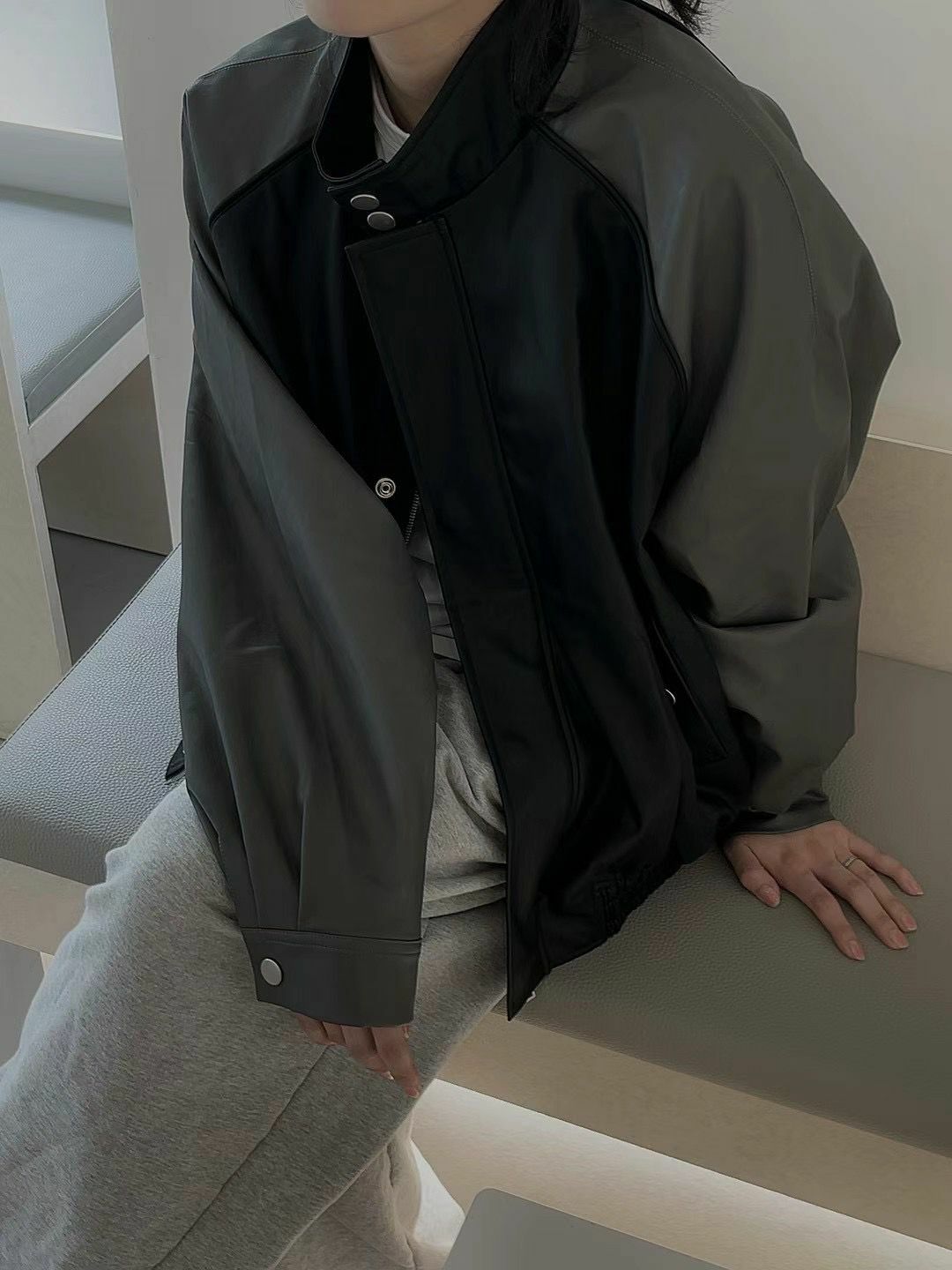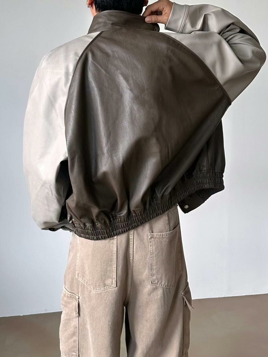 拼色企領拉鍊合成皮褸 LOCAL-003JK