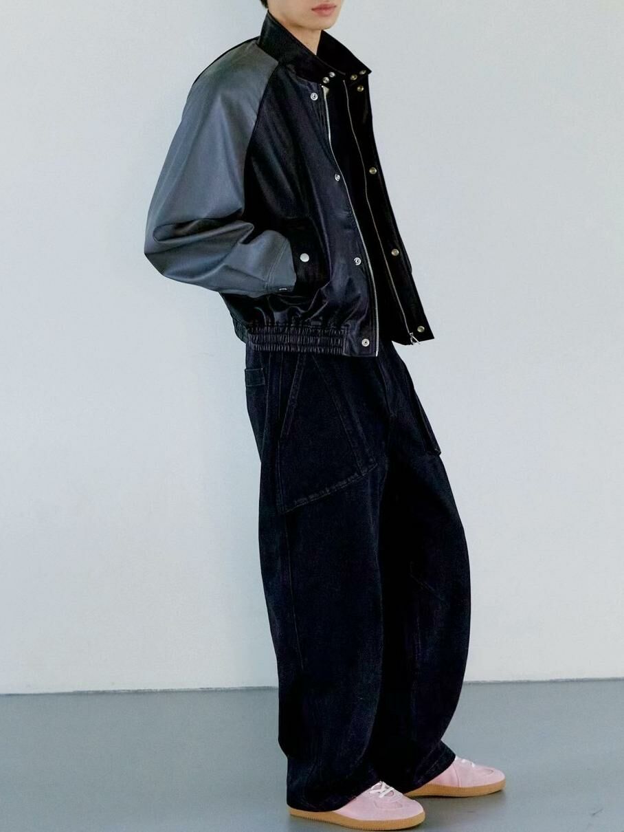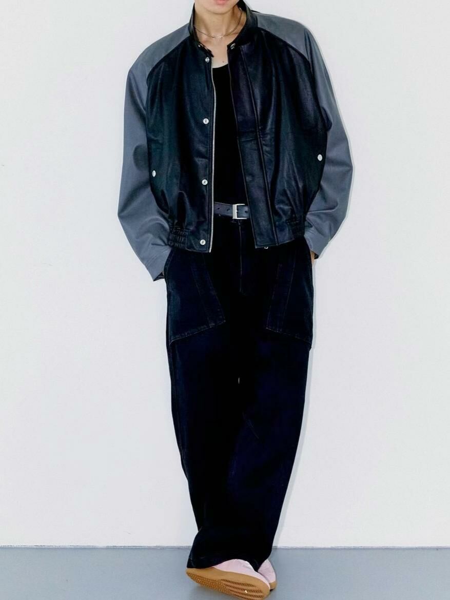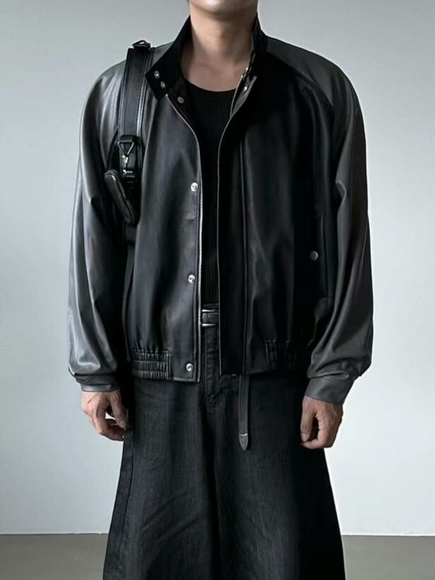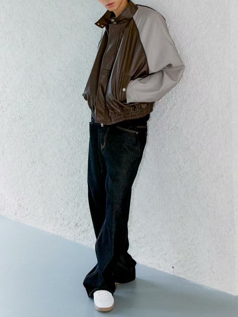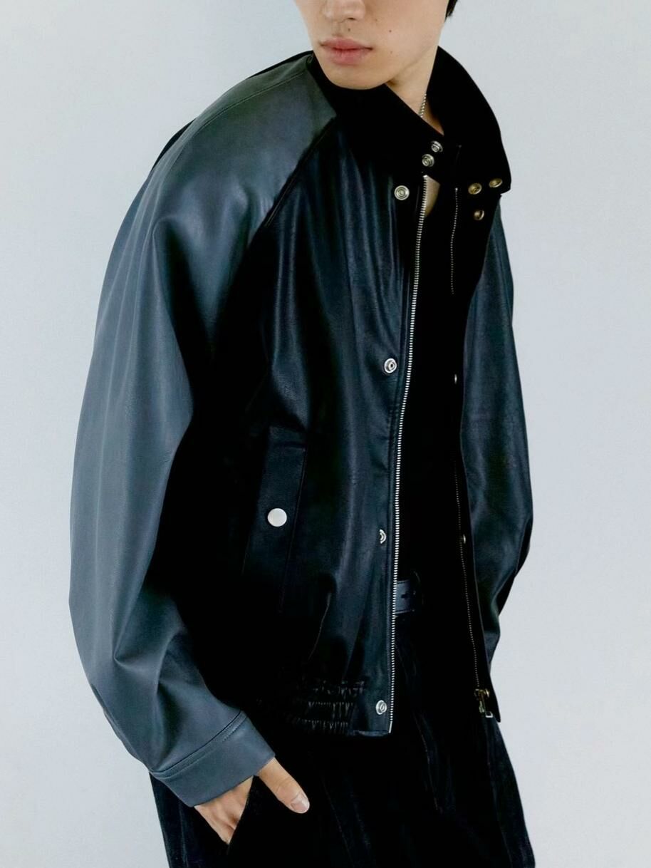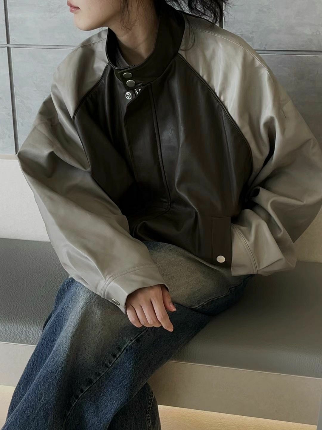 拼色企領拉鍊合成皮褸 LOCAL-003JK