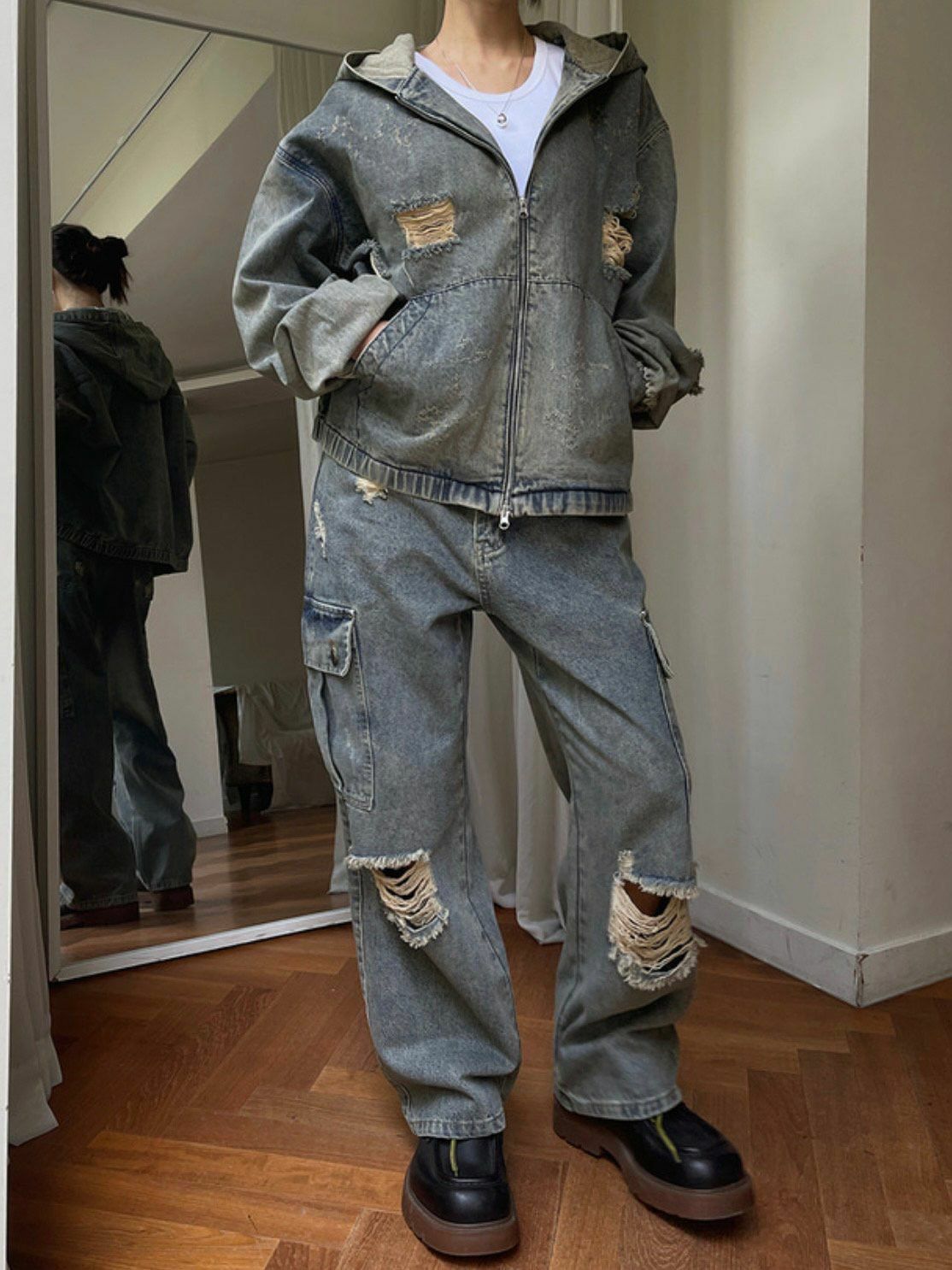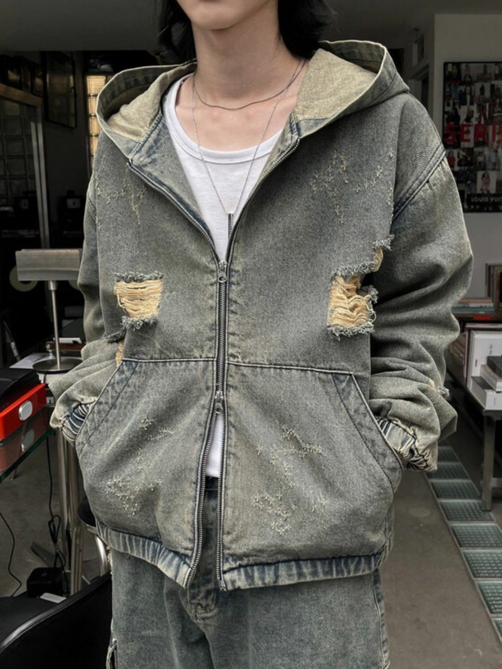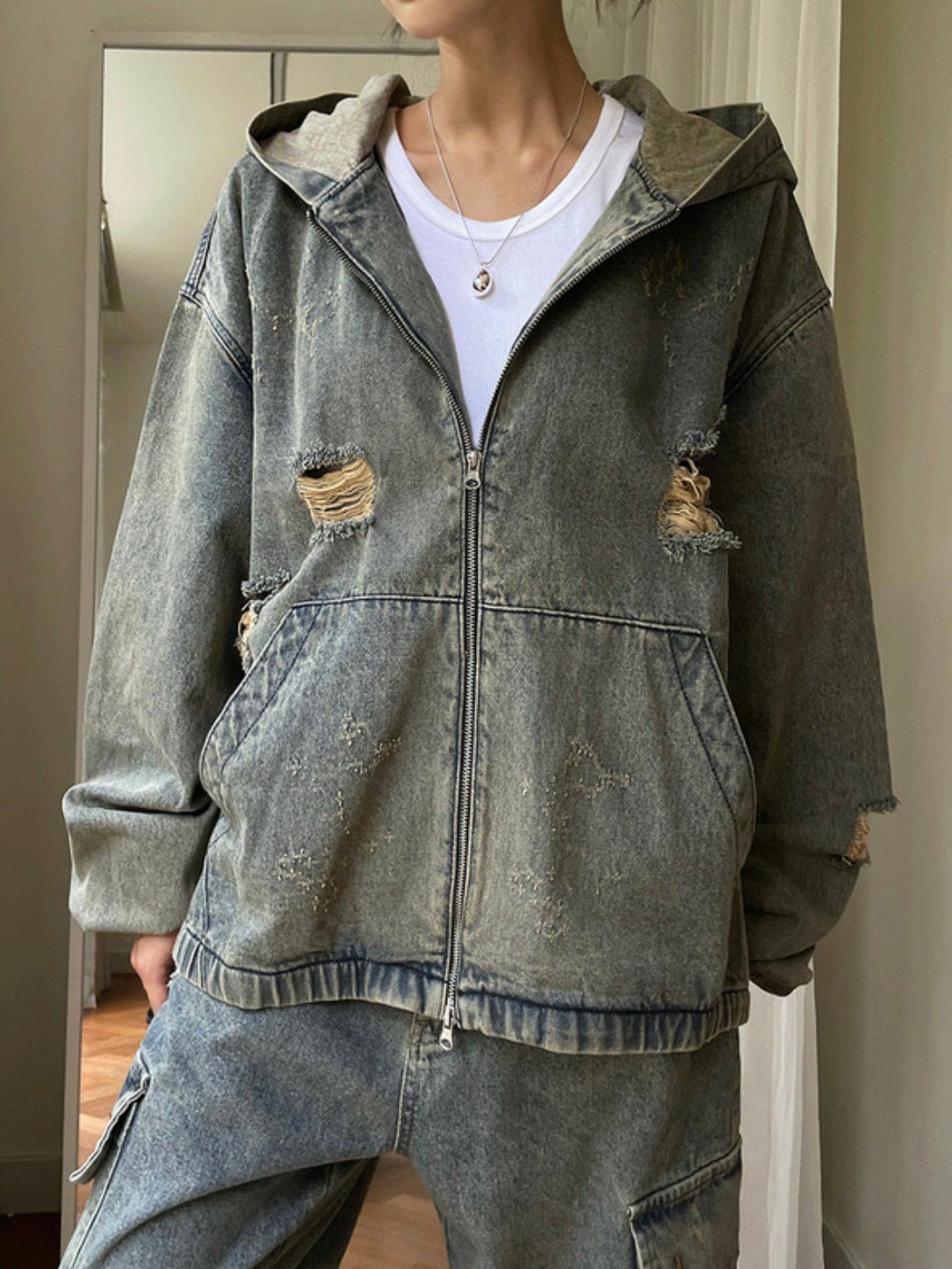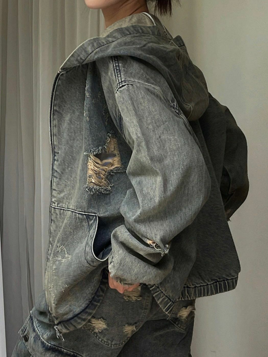 洗水破洞連帽拉鍊牛仔外套 Million-015JK