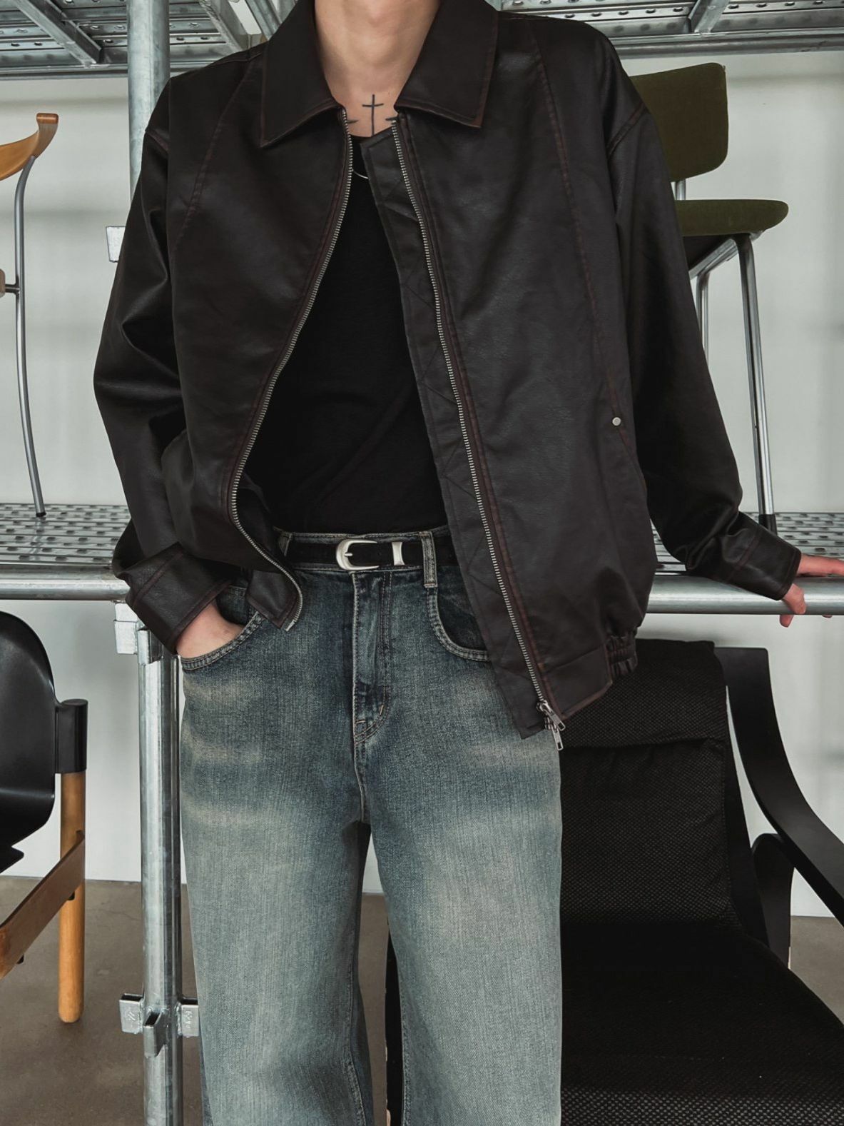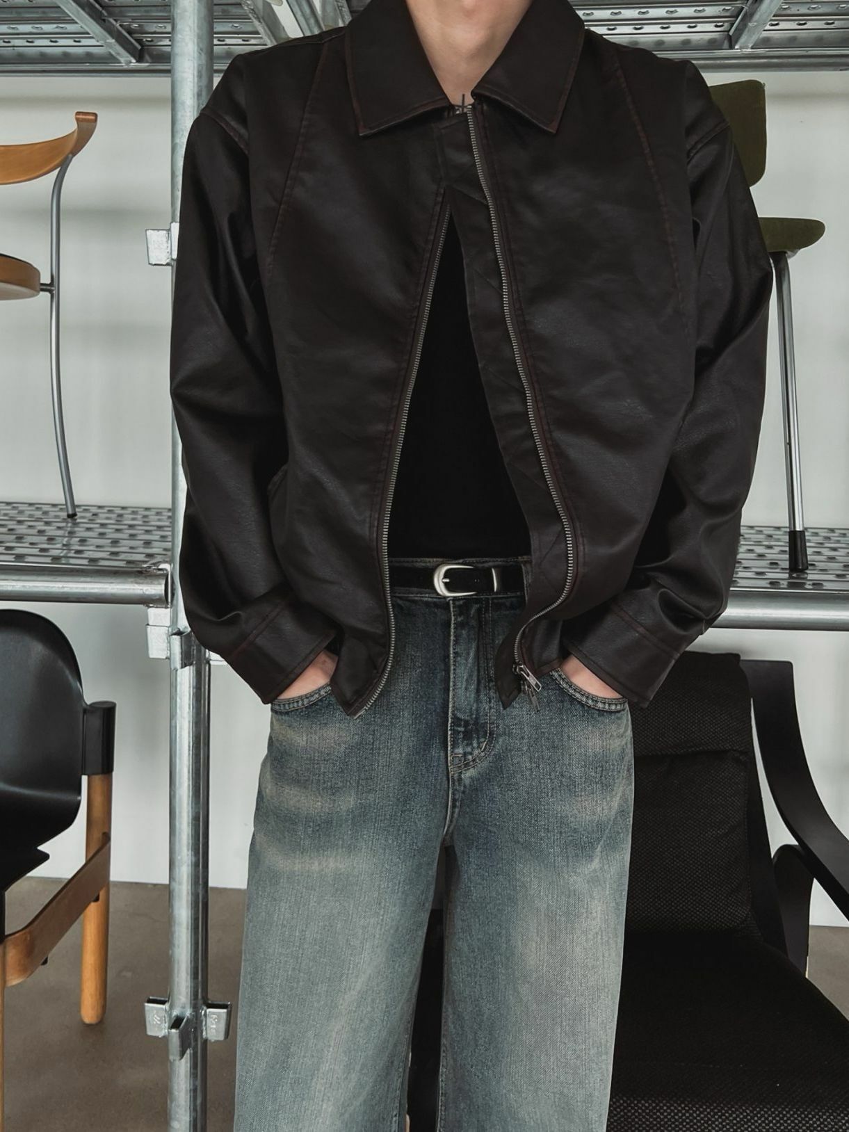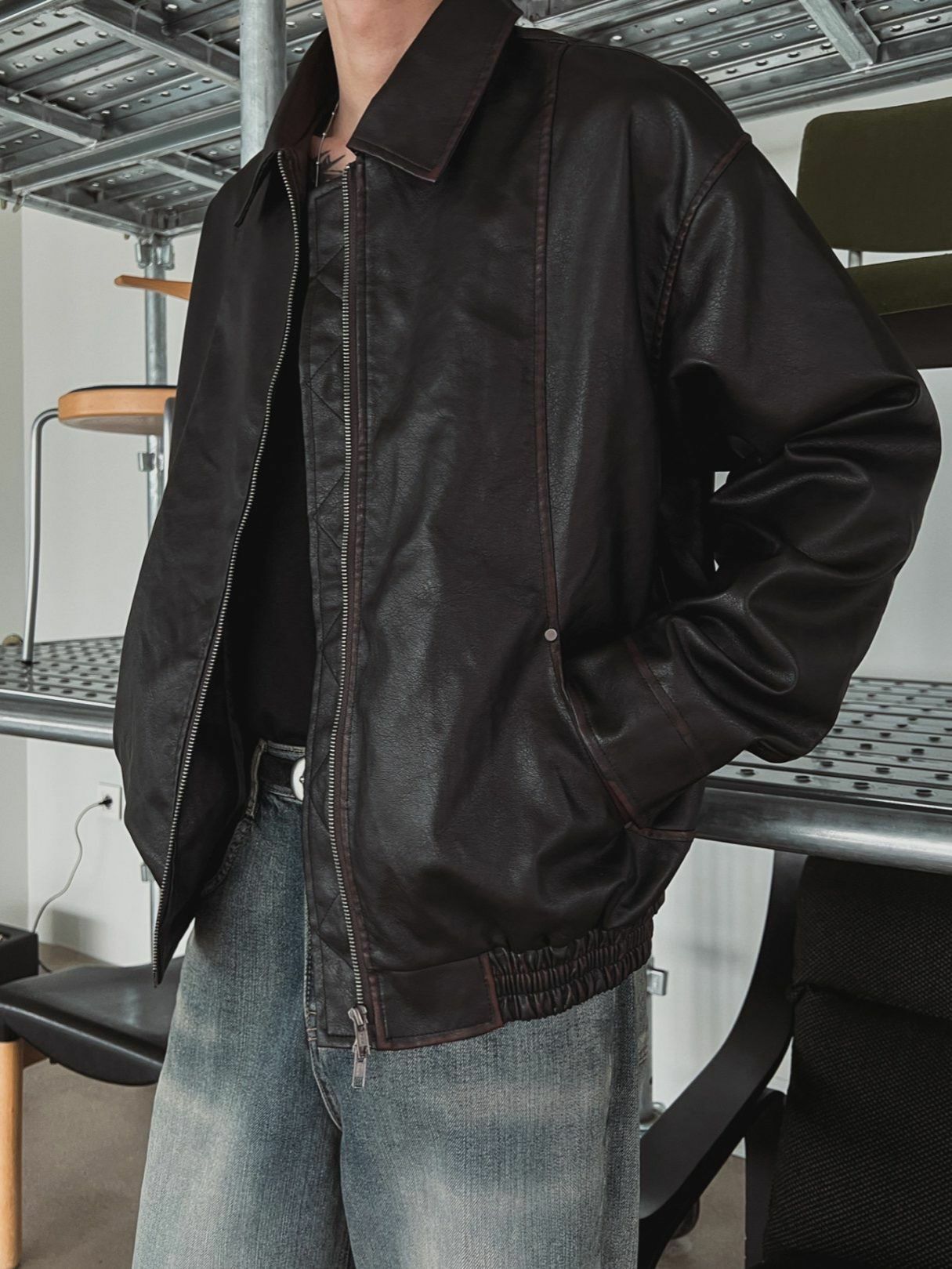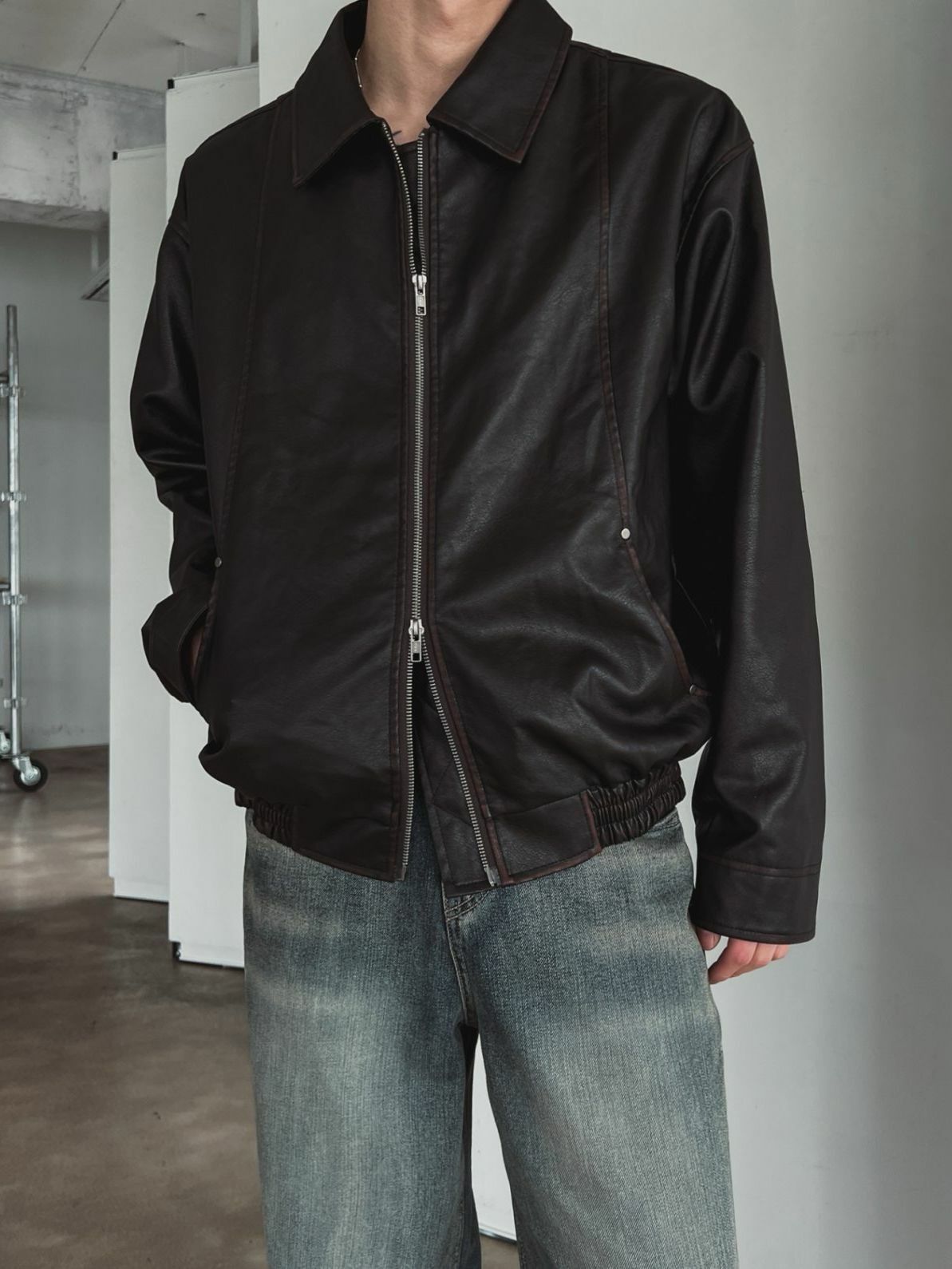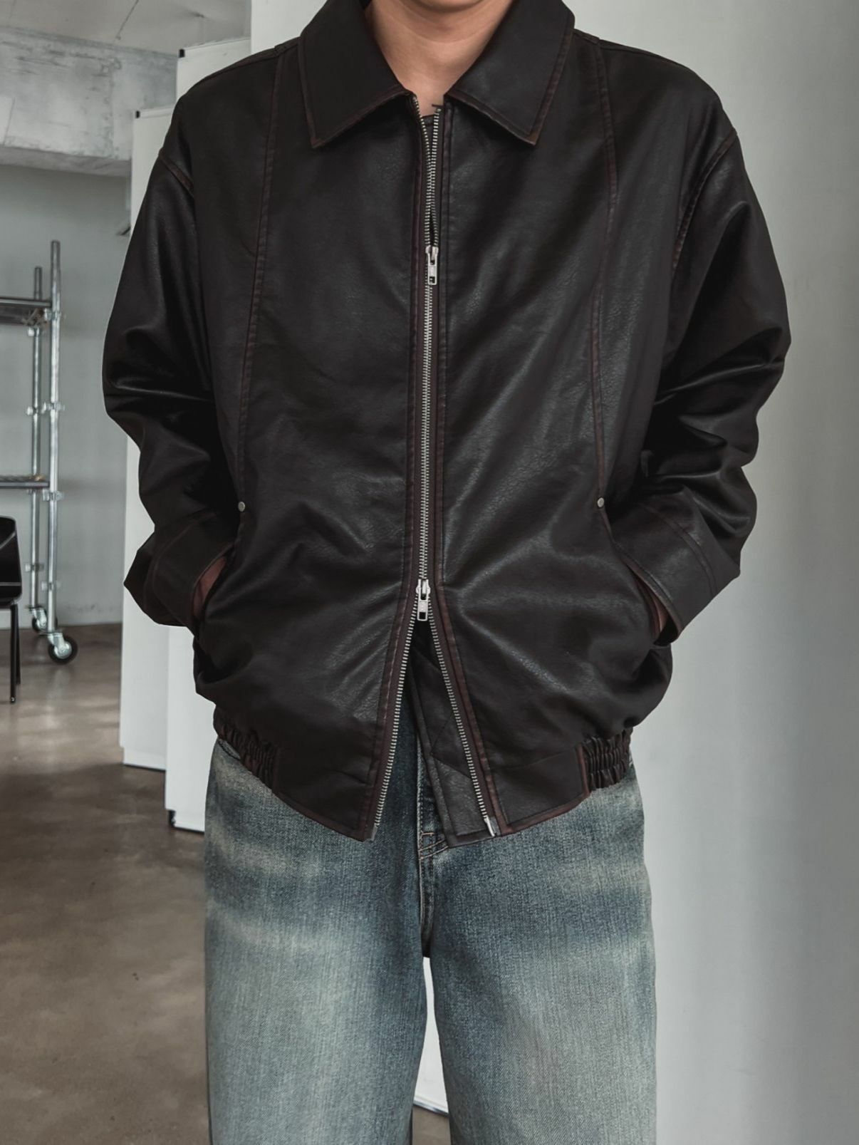 淨色反領拉鍊合成皮褸 OUR ROOM-057JK