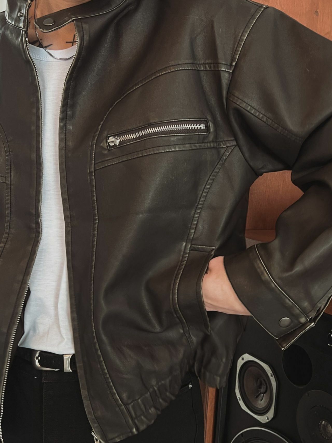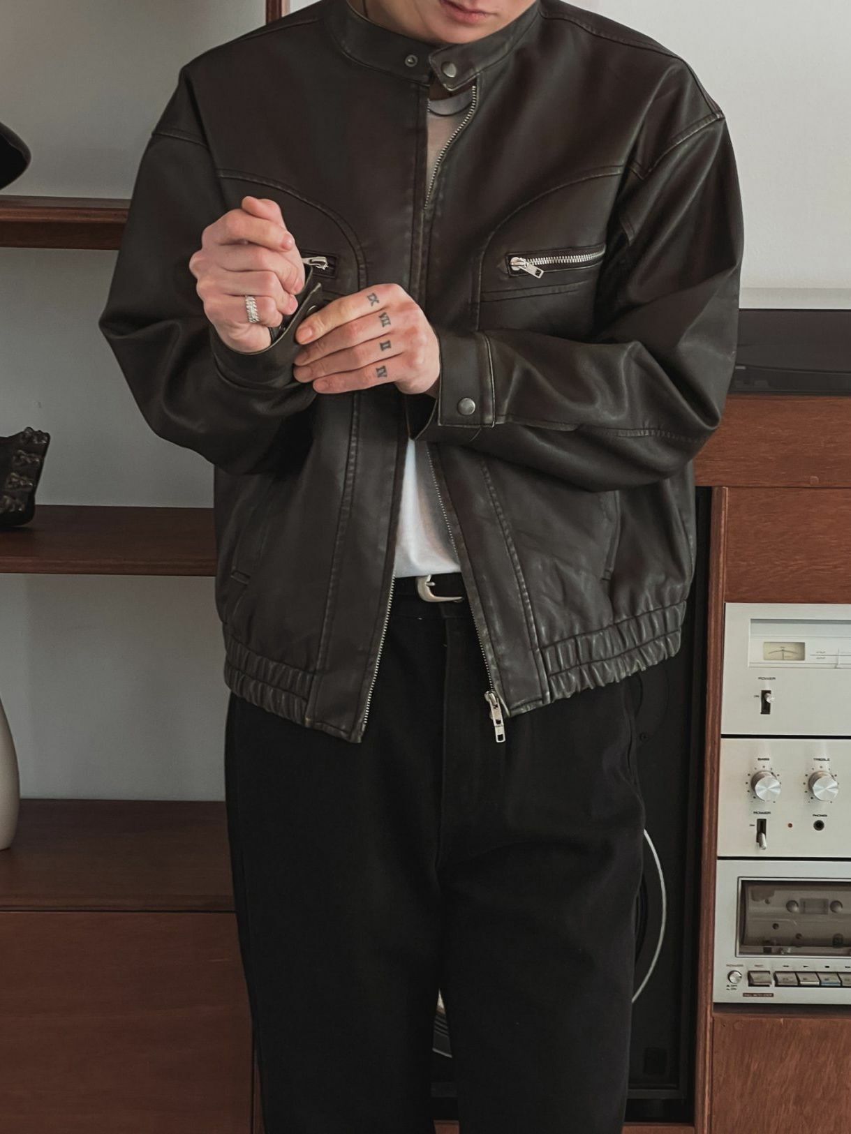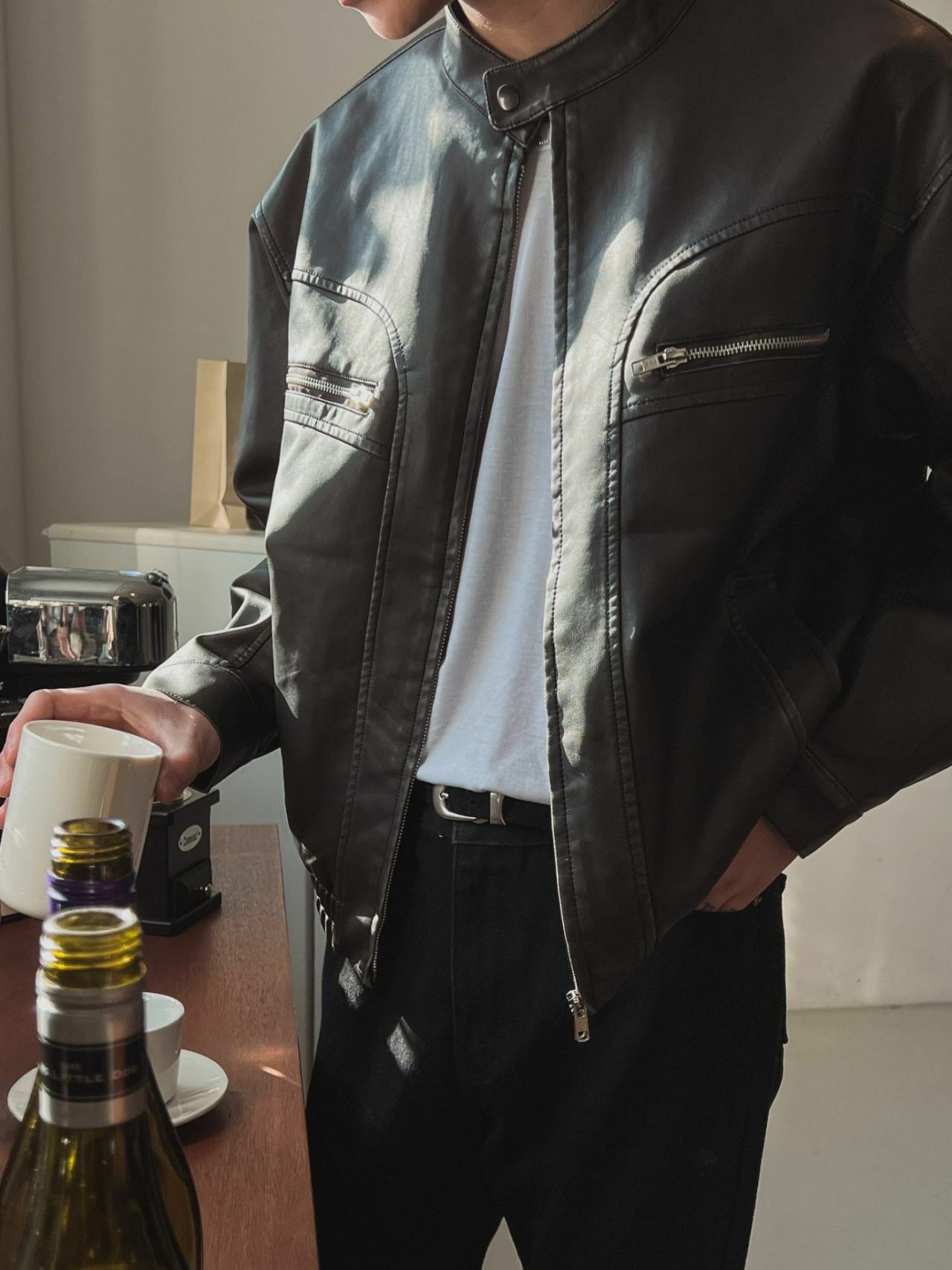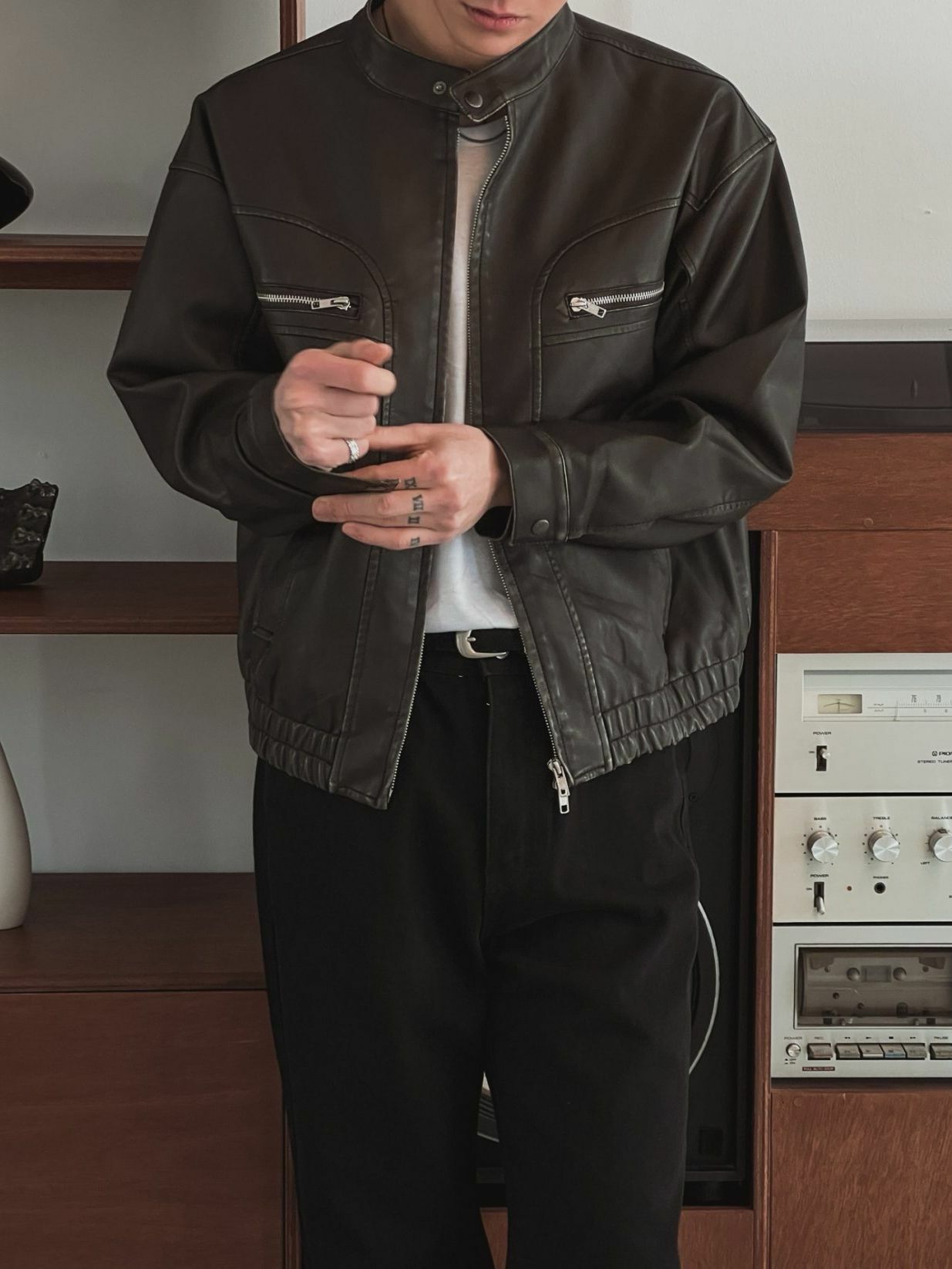 淨色企領拉鍊合成皮褸 OUR ROOM-058JK