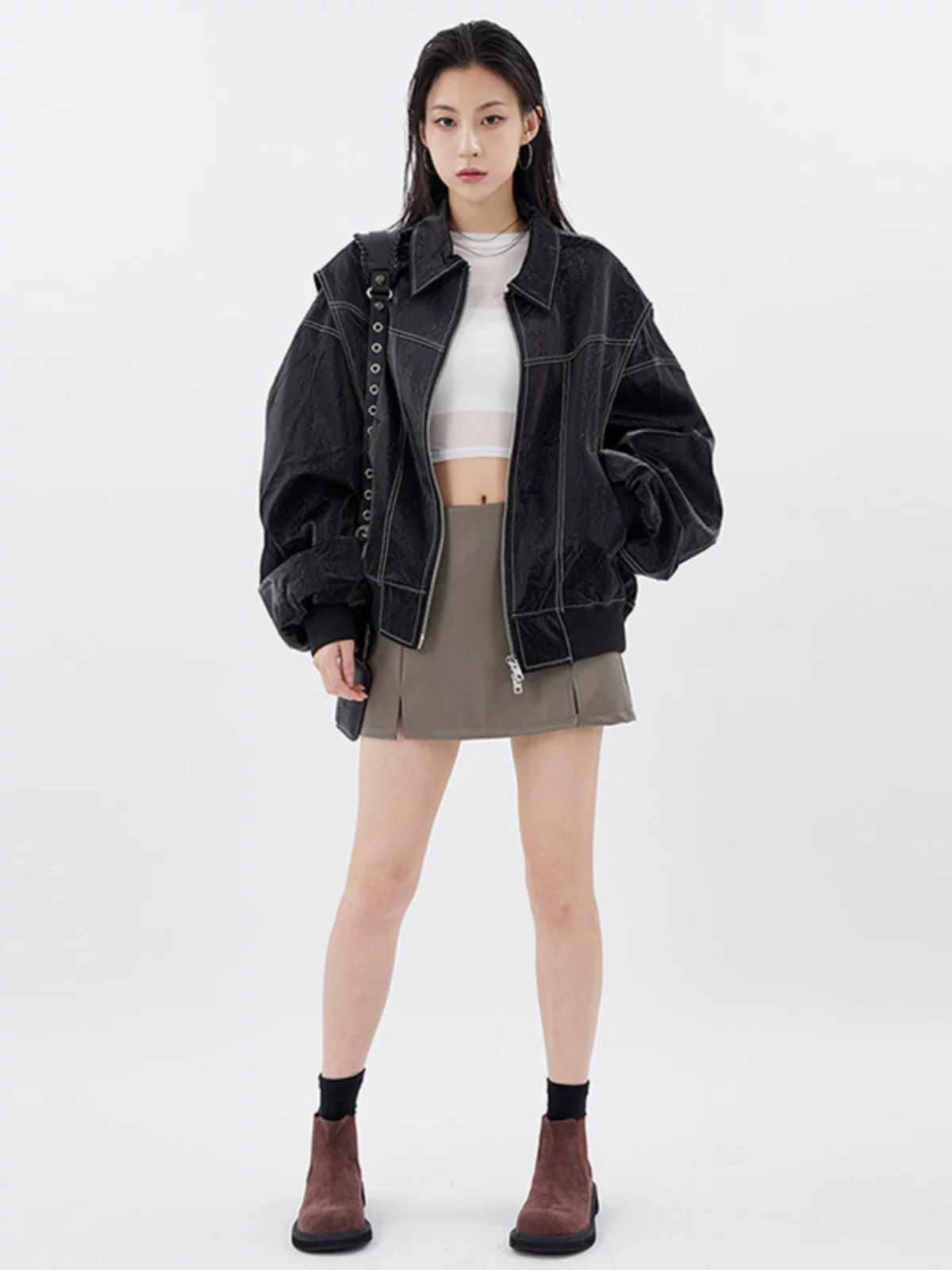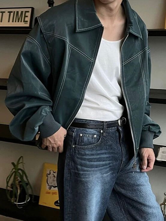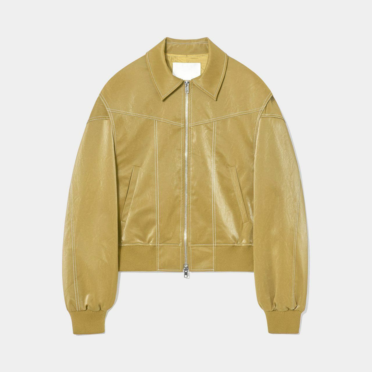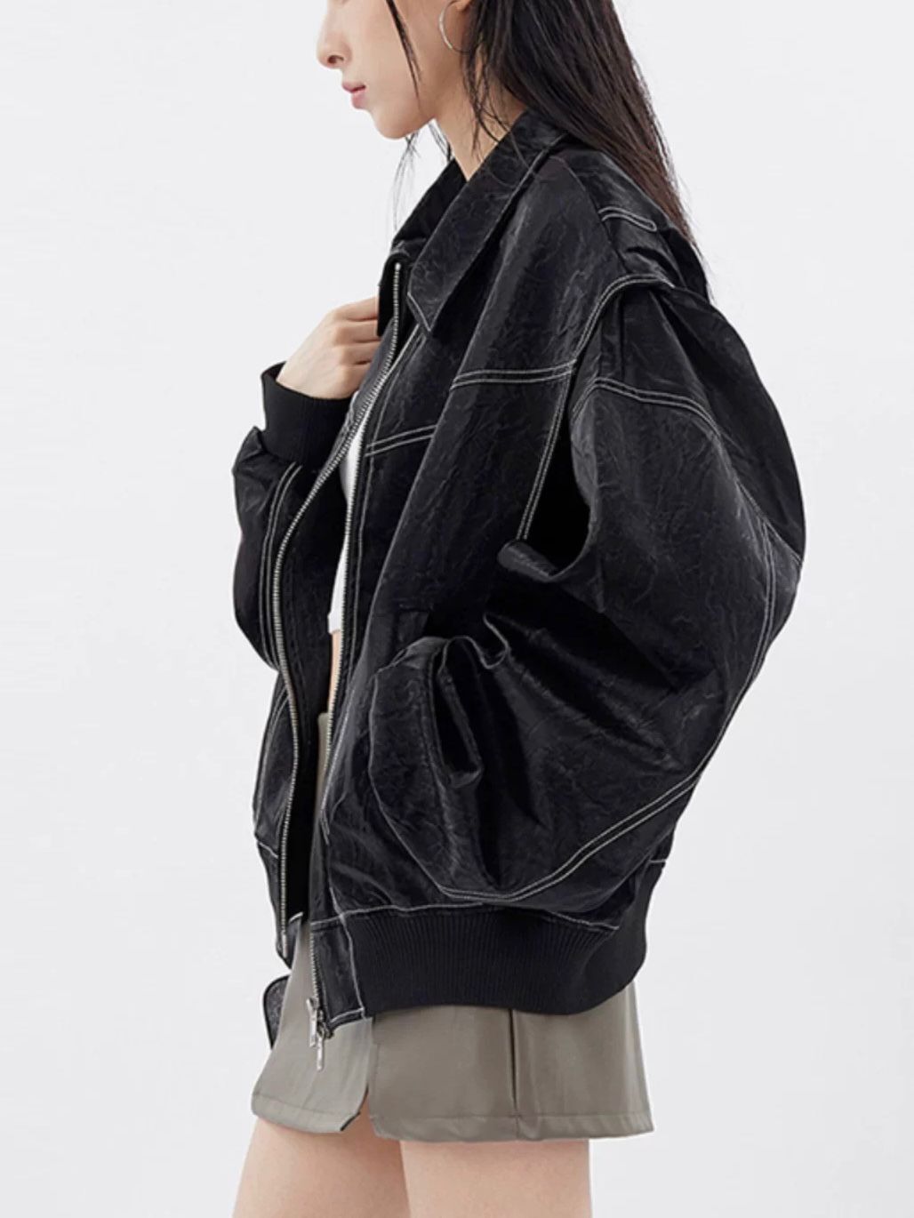 恤衫領明線拉鍊合成皮褸 OWN-027JK