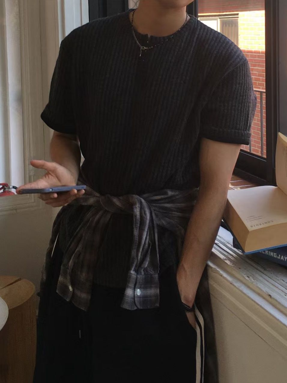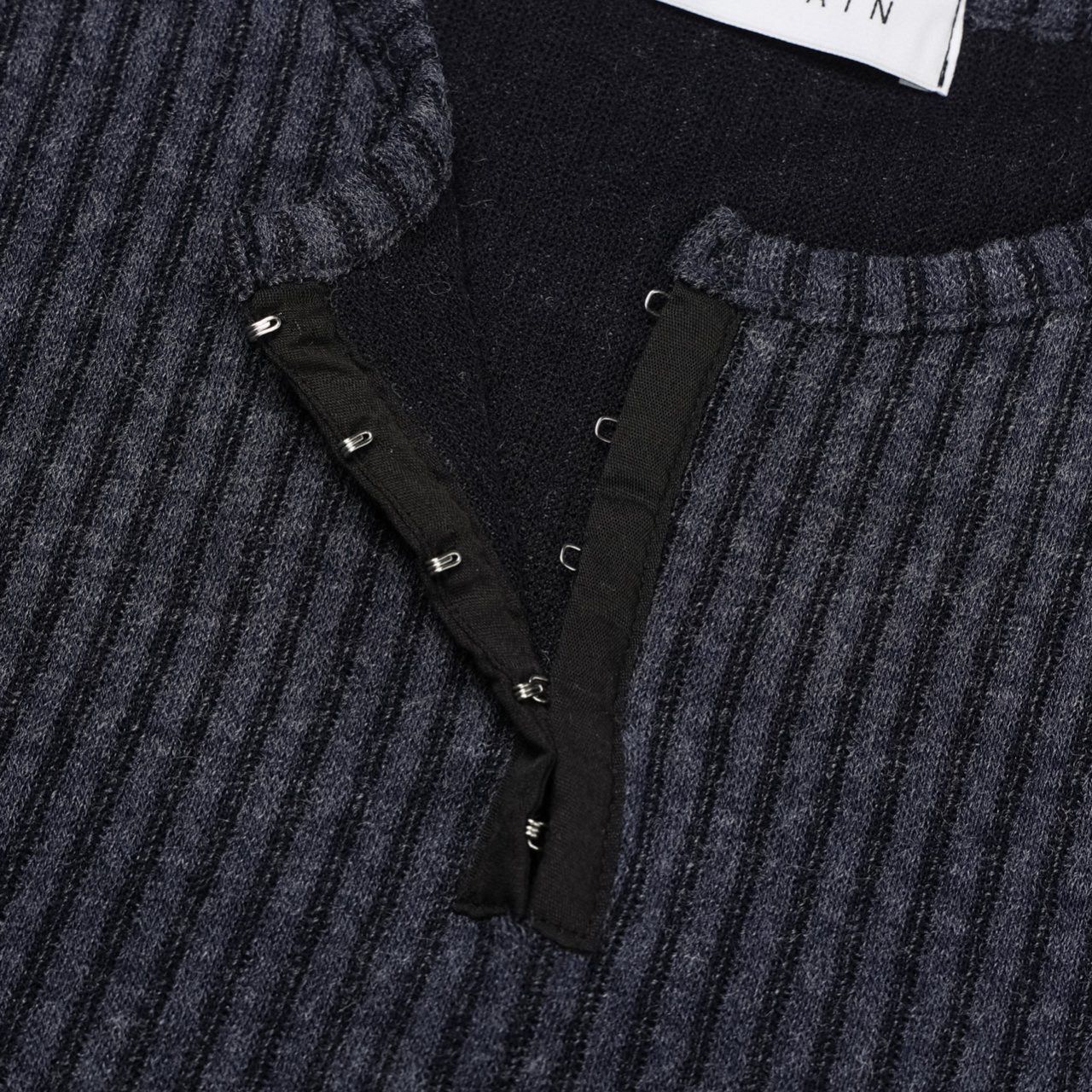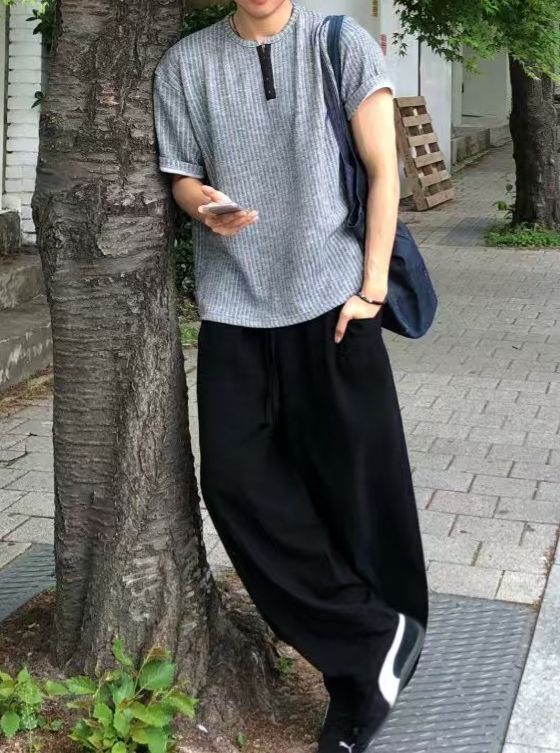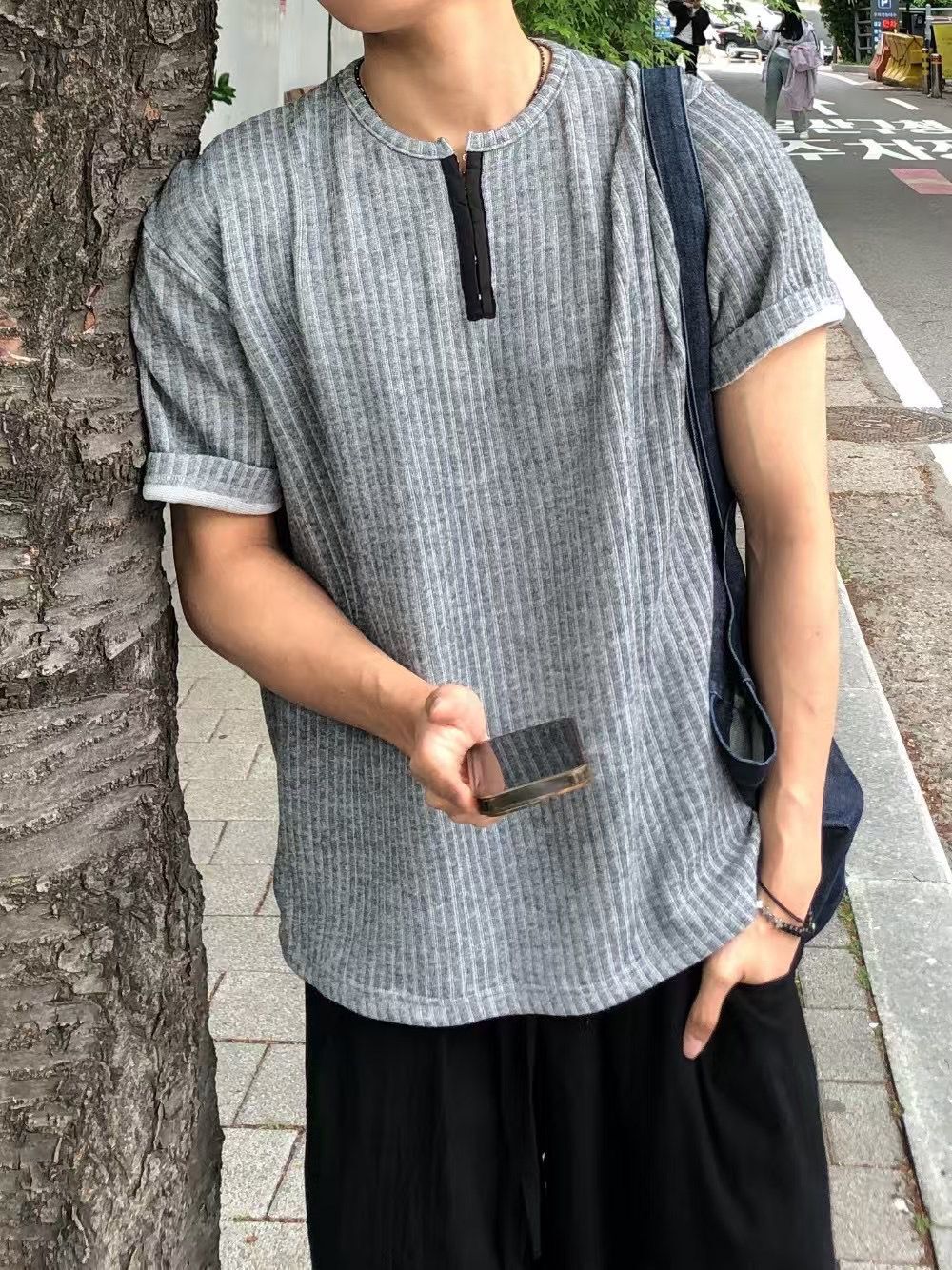 淨色暗直紋半開胸短袖Tee REMAIN-010T