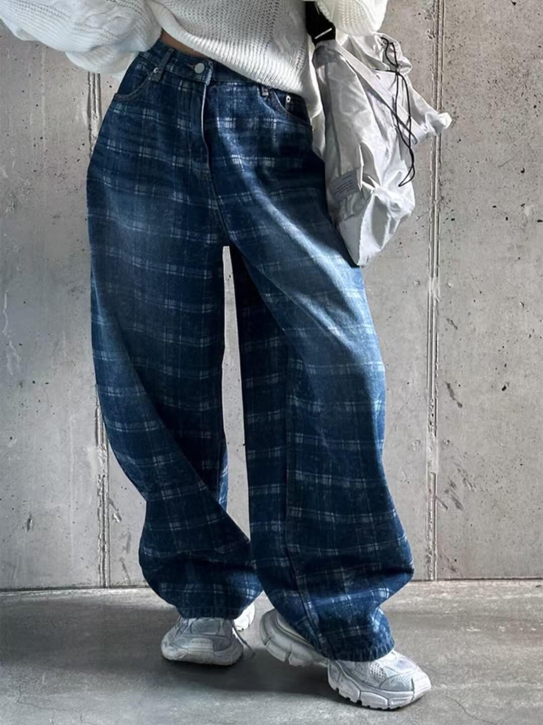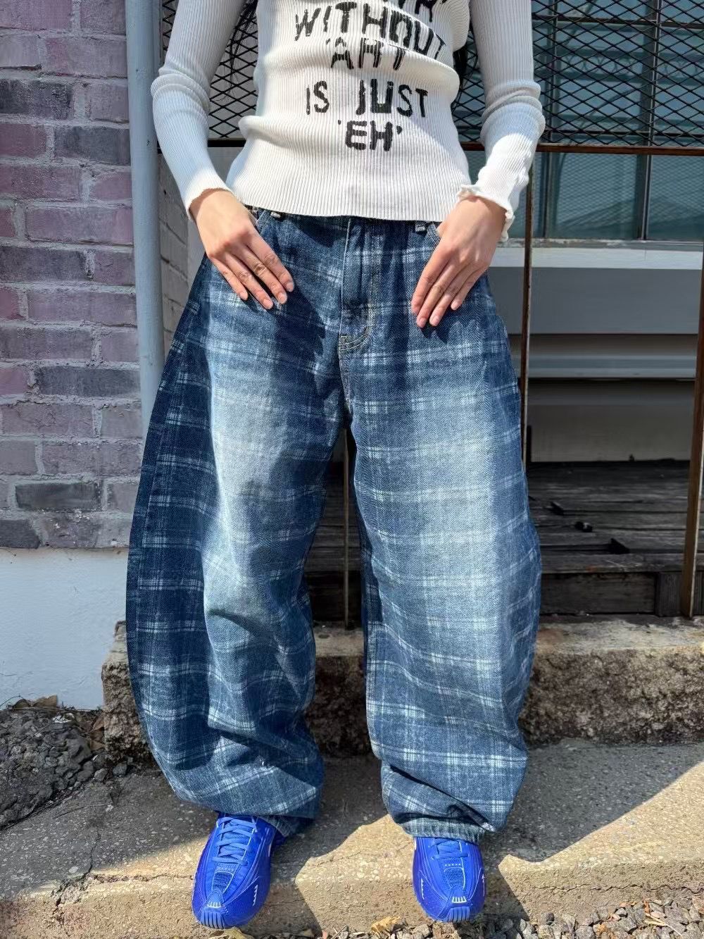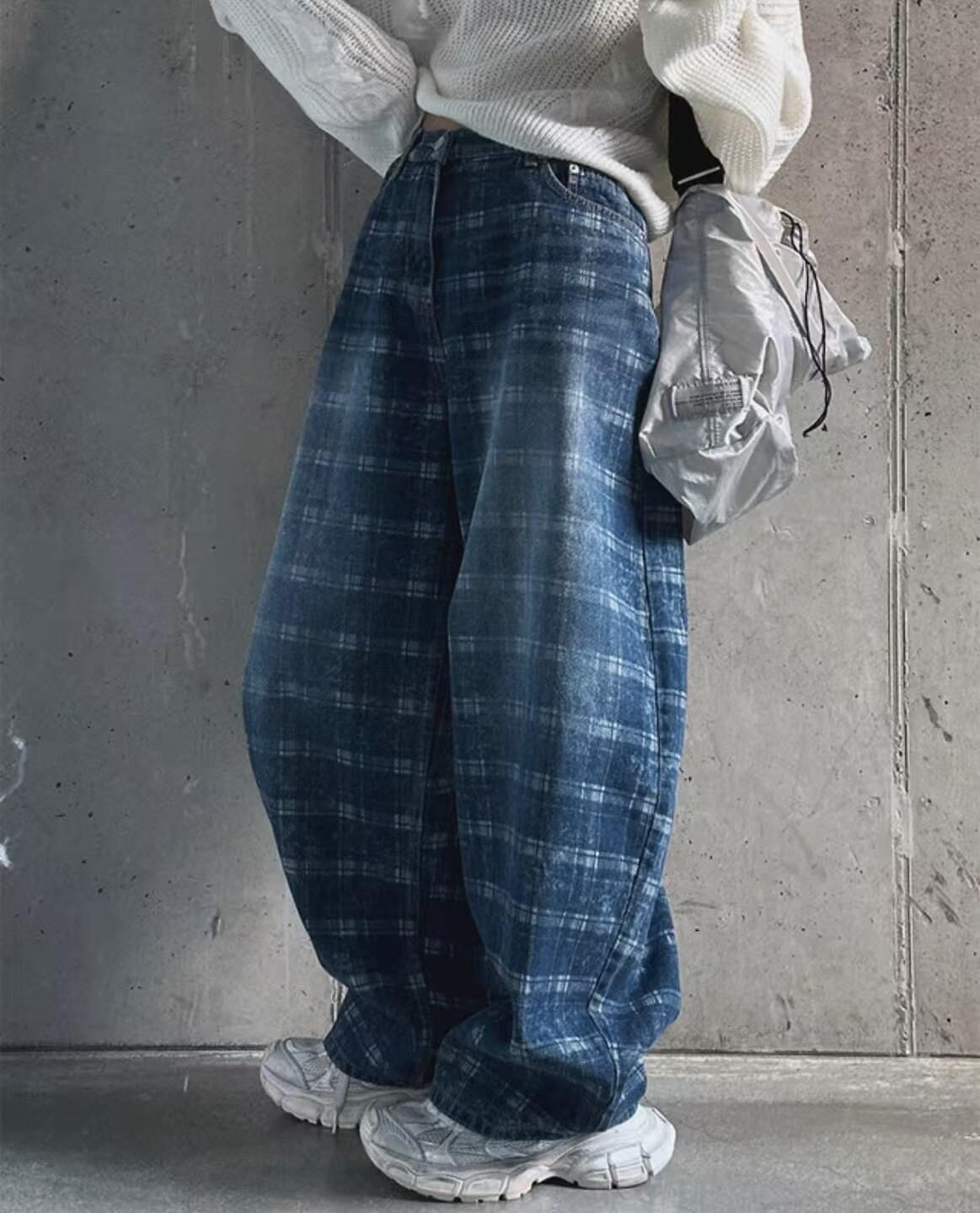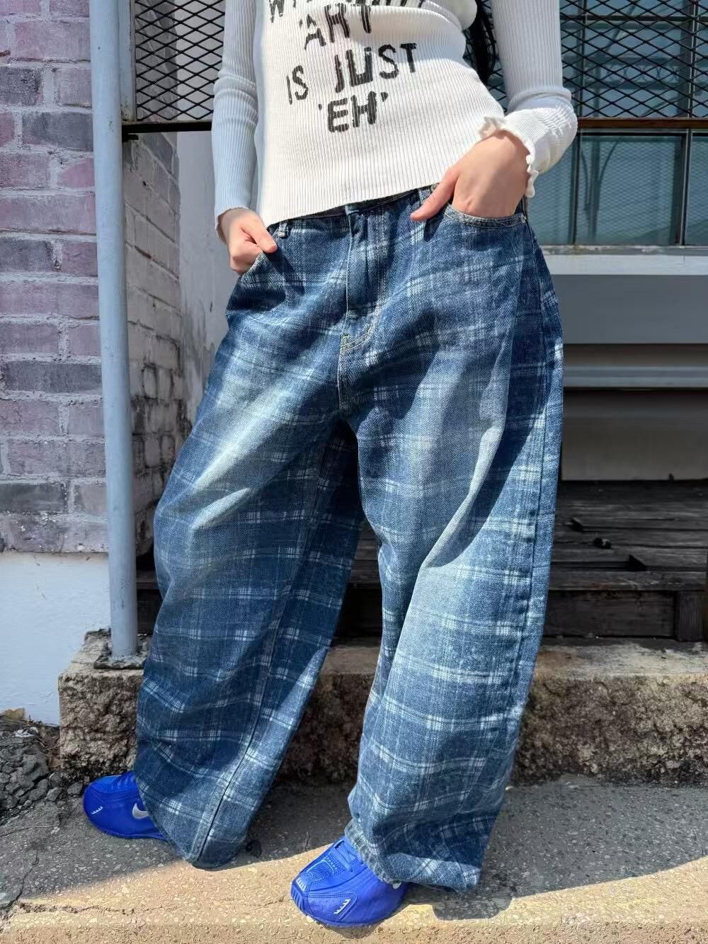 洗水格紋鬆身牛仔褲 Seeot-030P