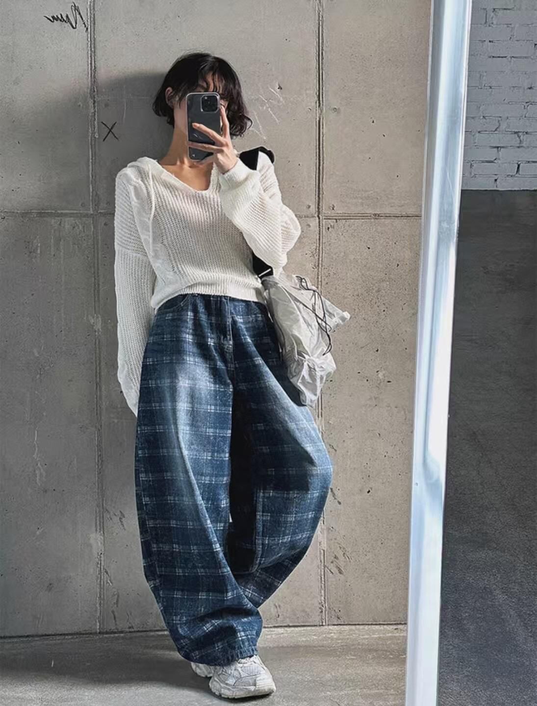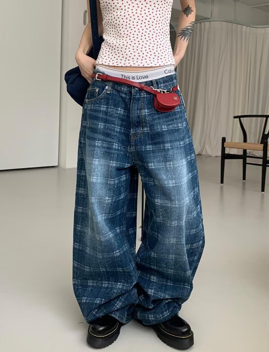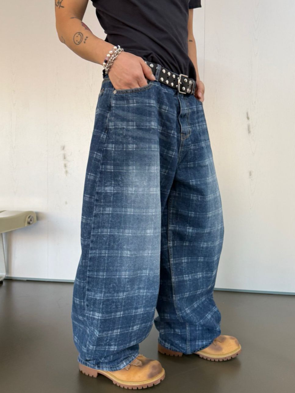 洗水格紋鬆身牛仔褲 Seeot-030P