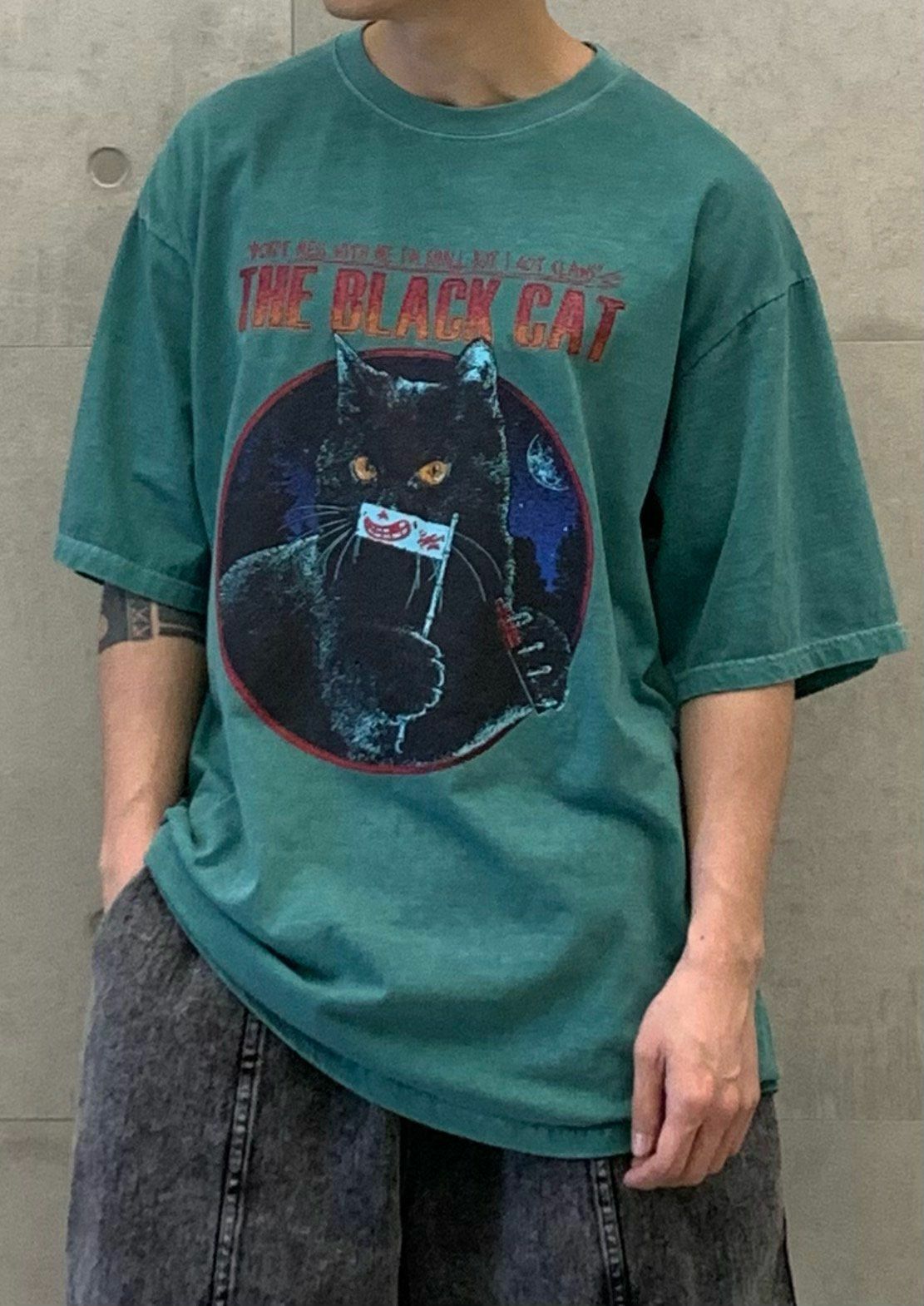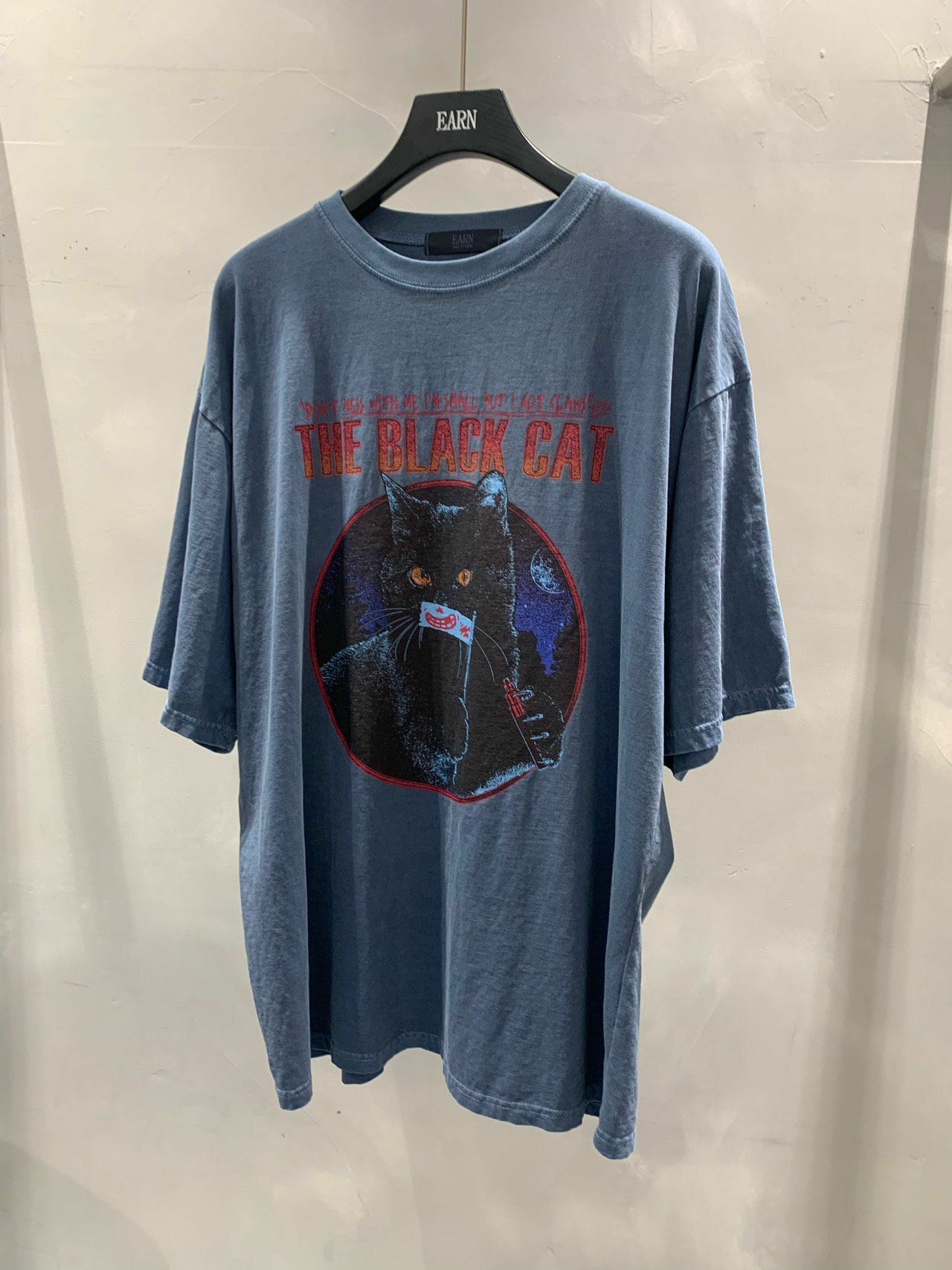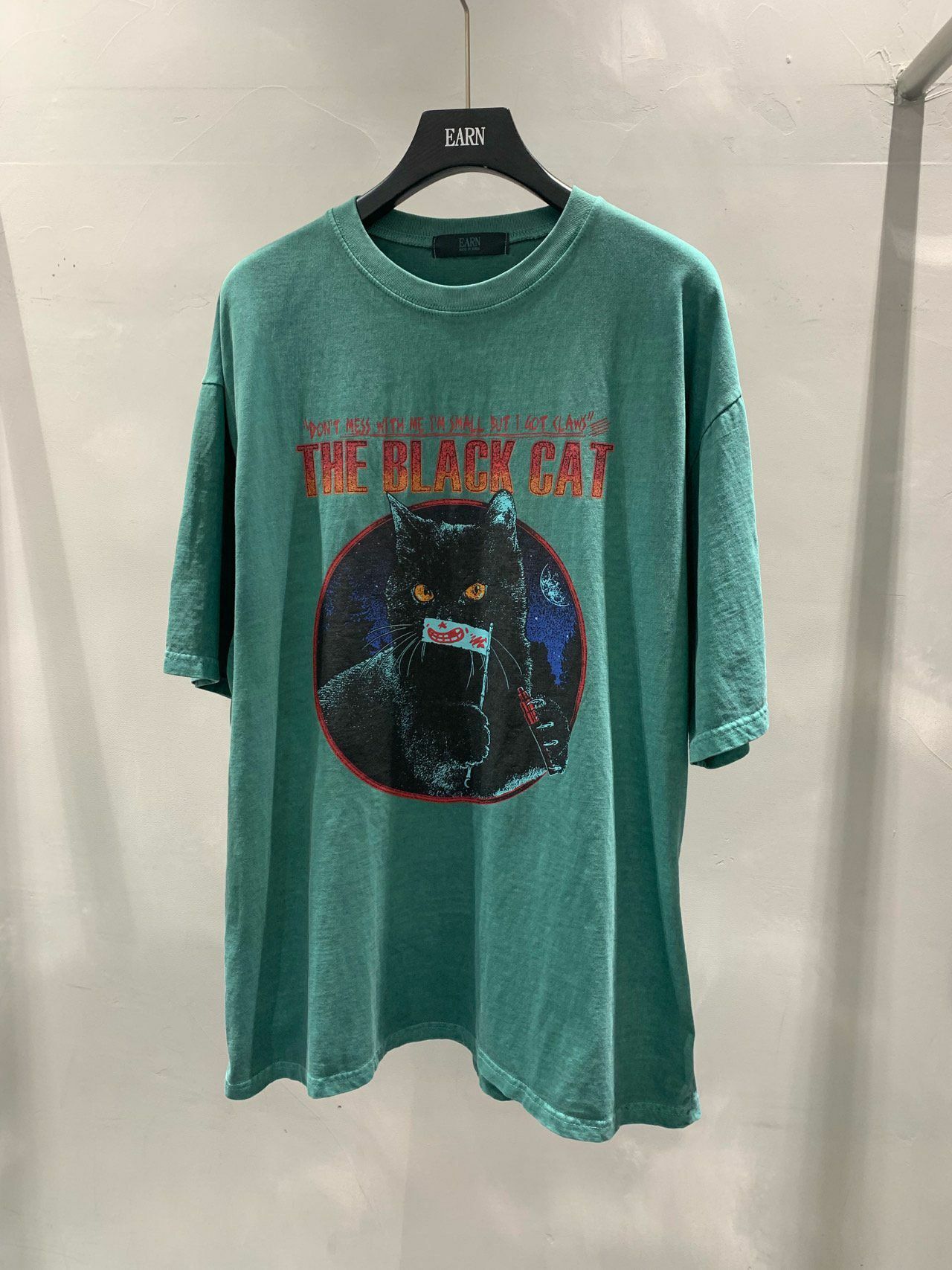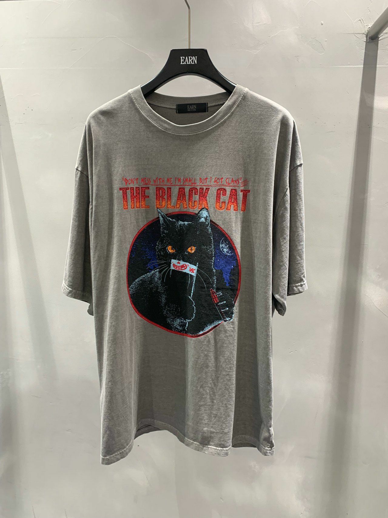 OverSize洗水英文字黑貓圖案短袖Tee EARN-034T