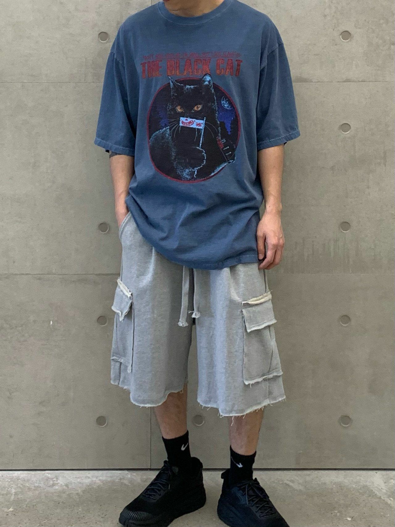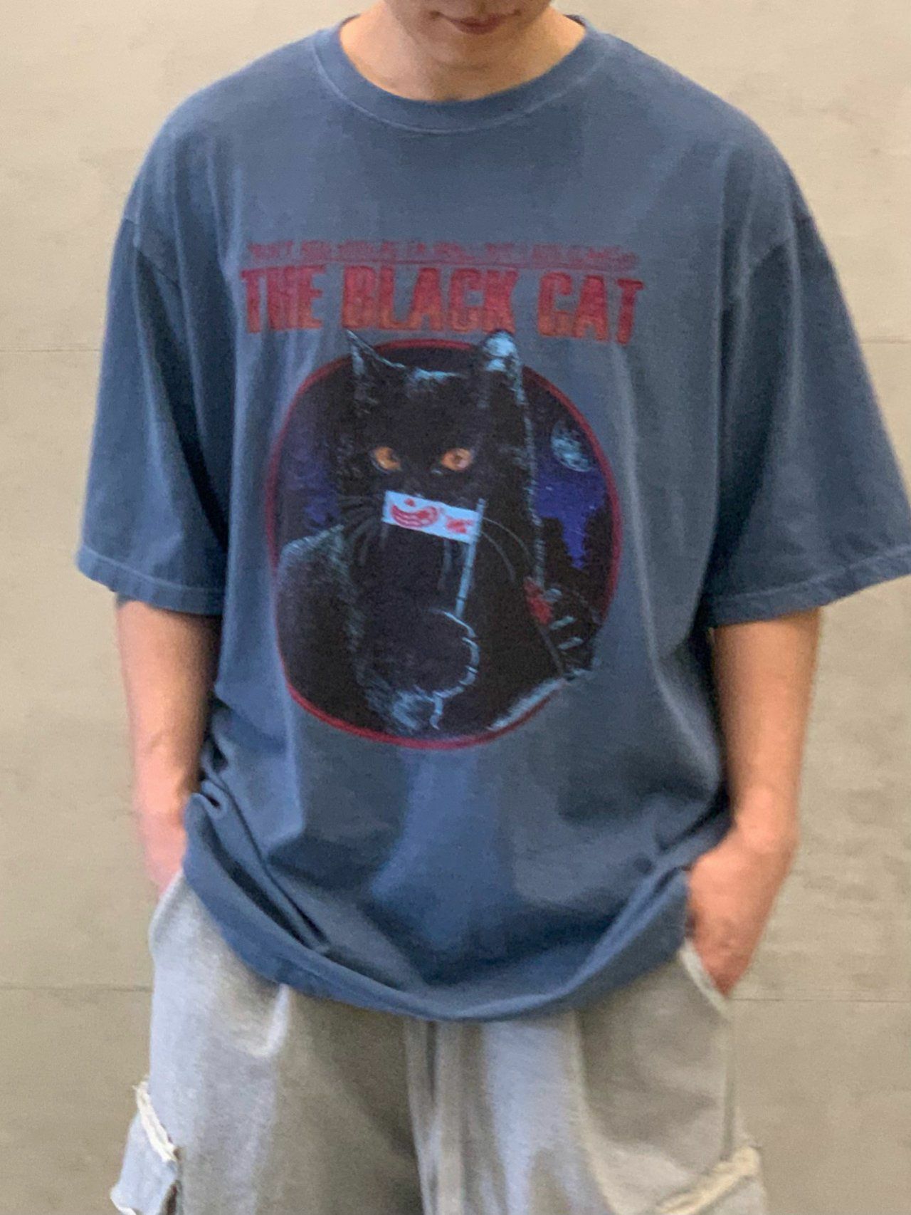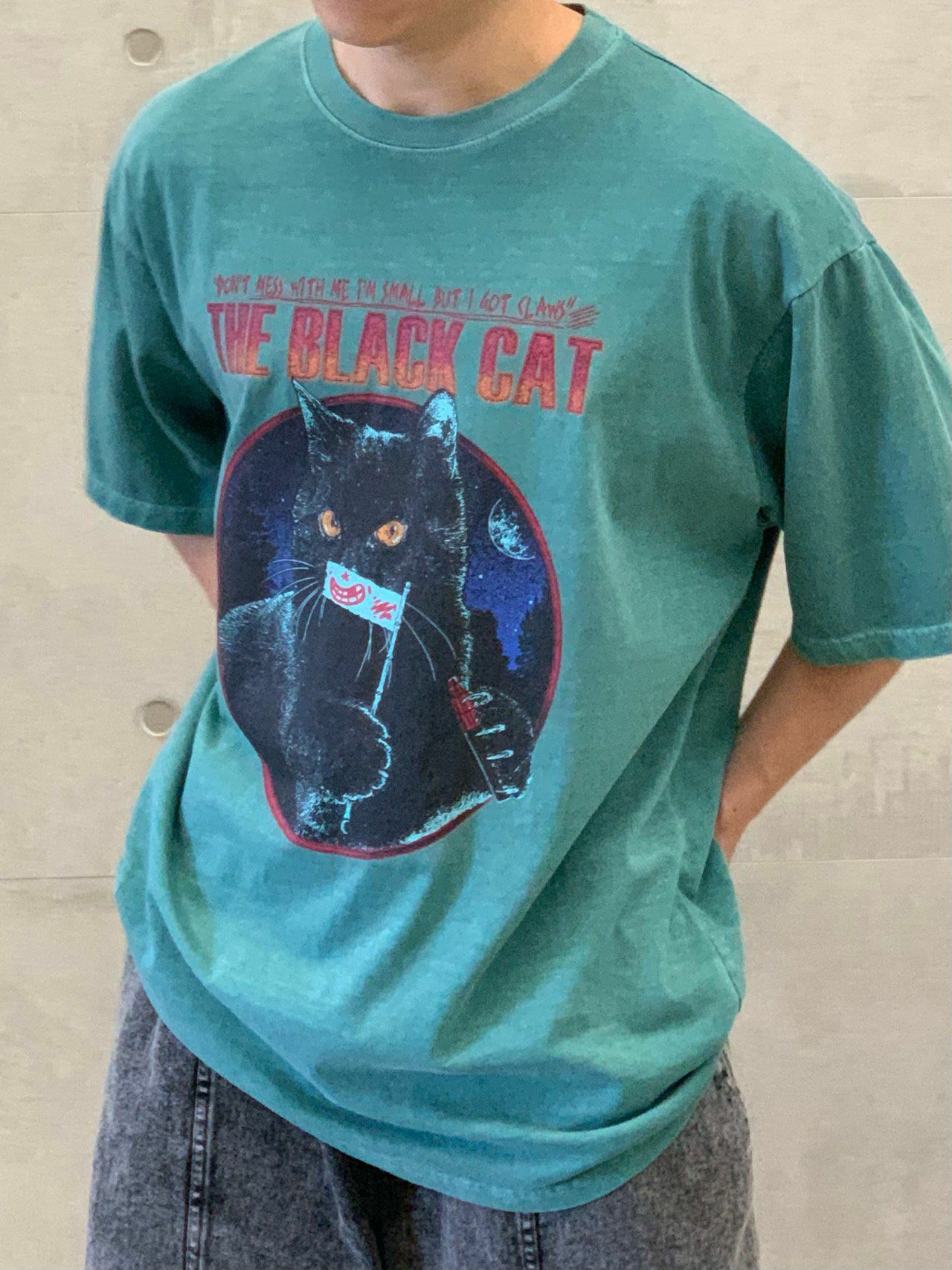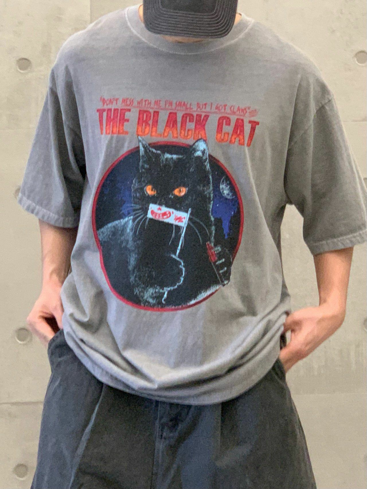 OverSize洗水英文字黑貓圖案短袖Tee EARN-034T
