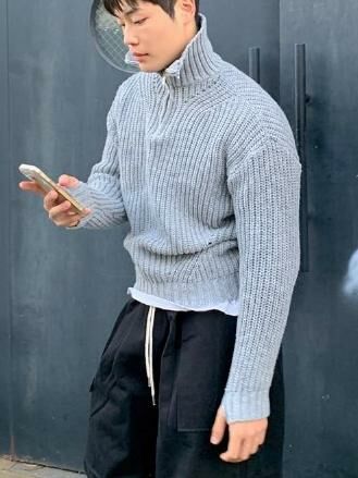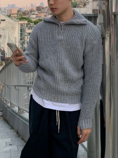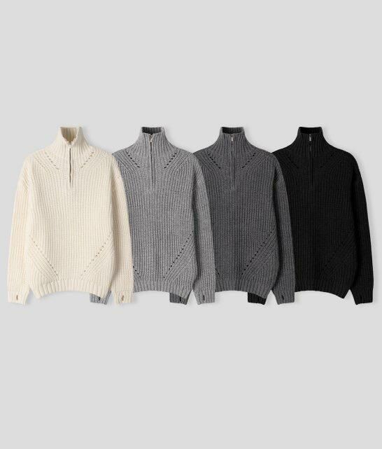 淨色反領半拉鍊暗直紋長袖針織衫 EARN-041T