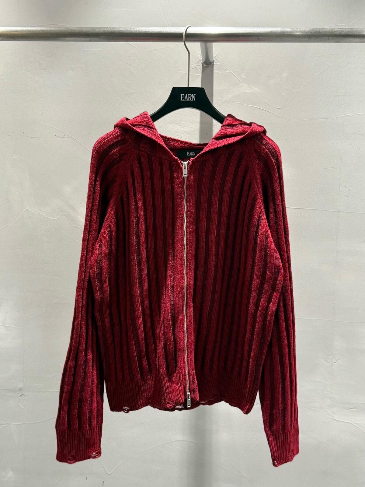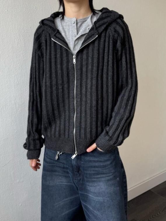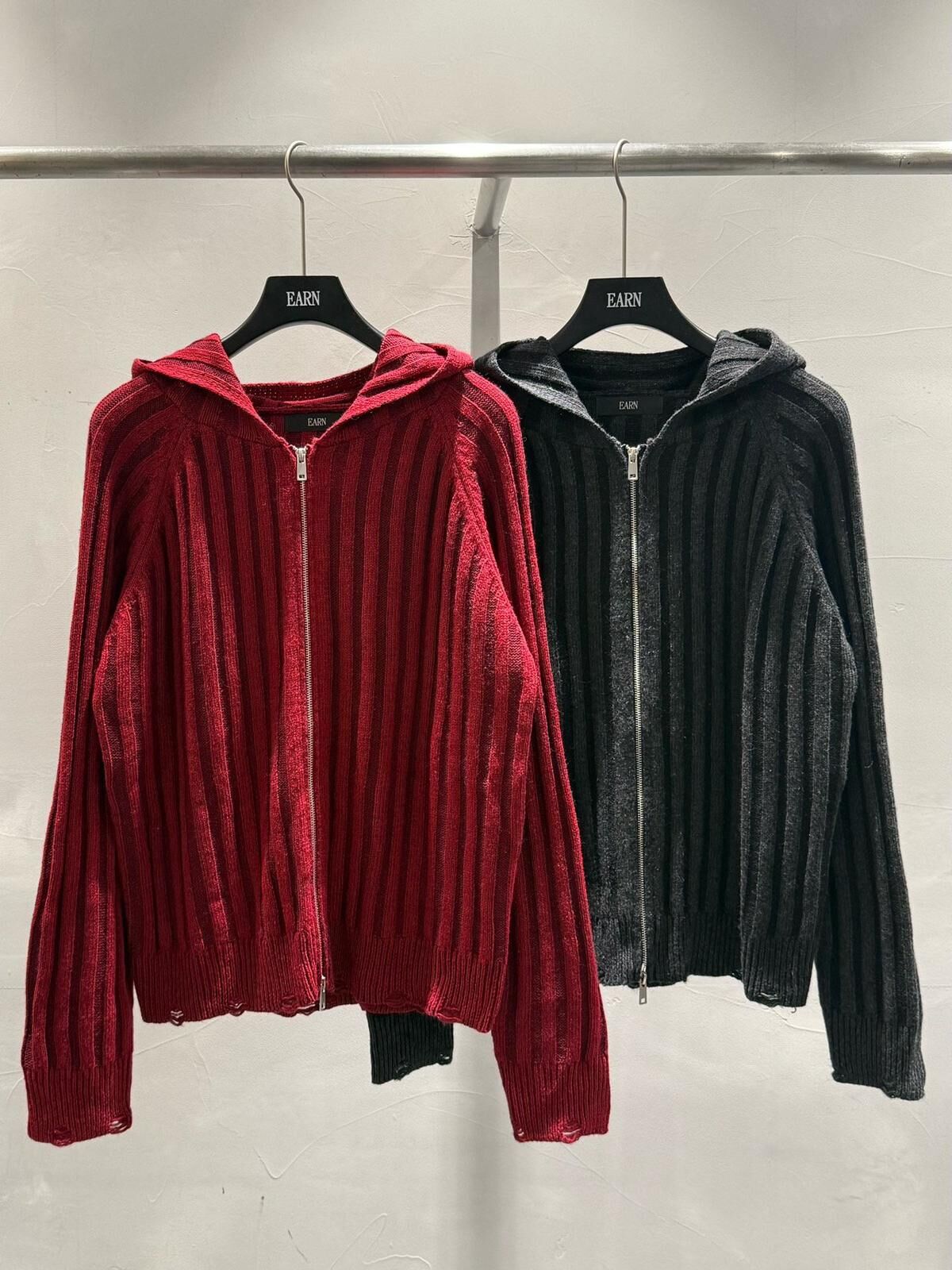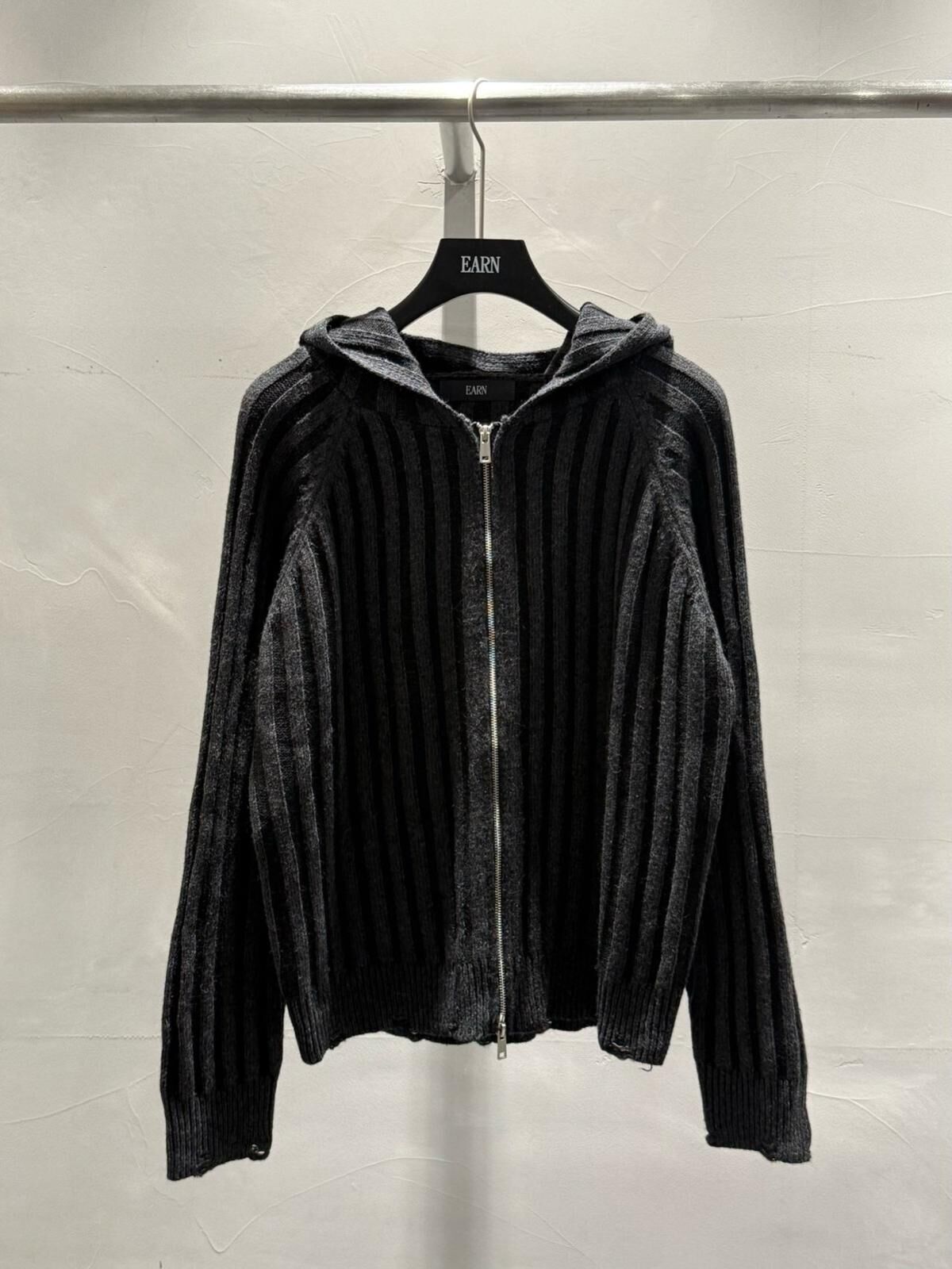 暗直紋拉鍊連帽針織外套 EARN-049JK