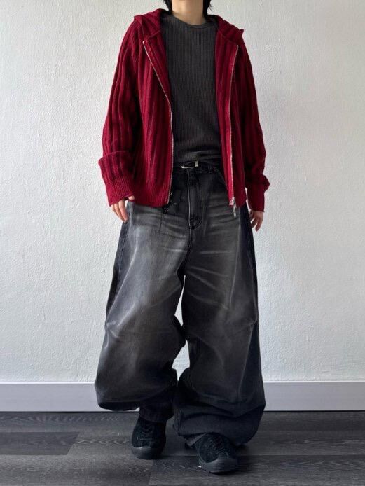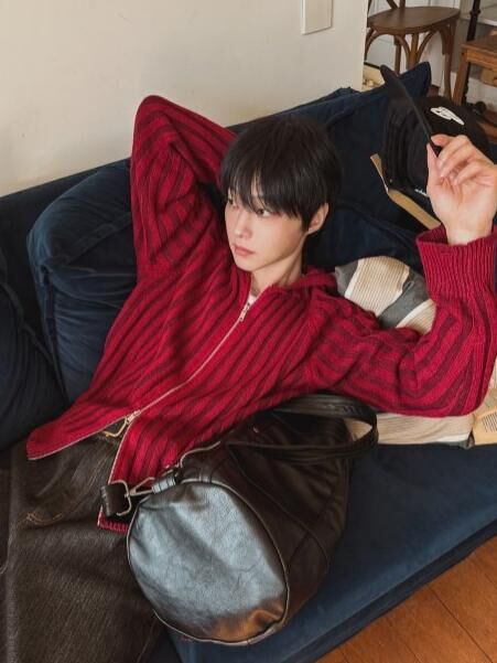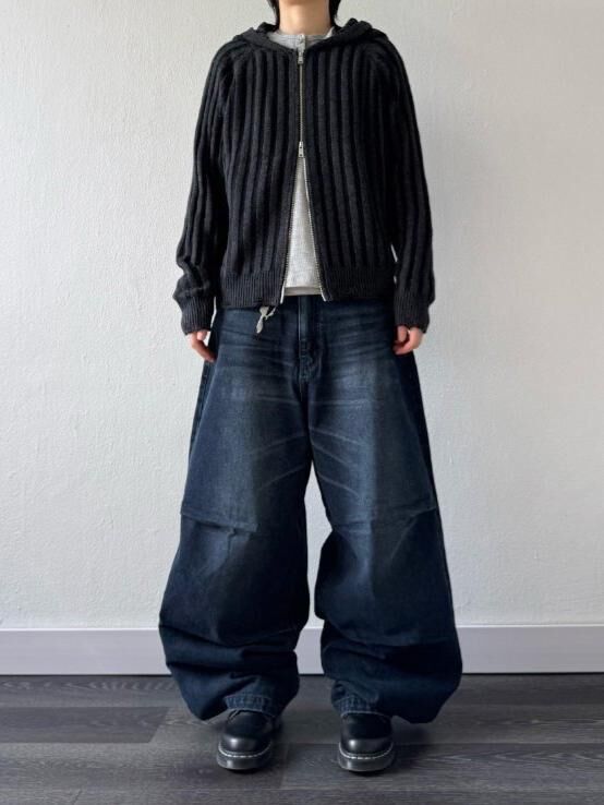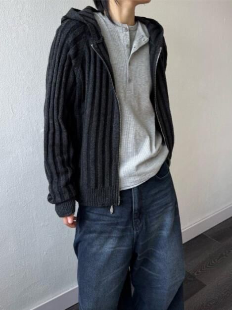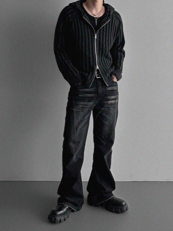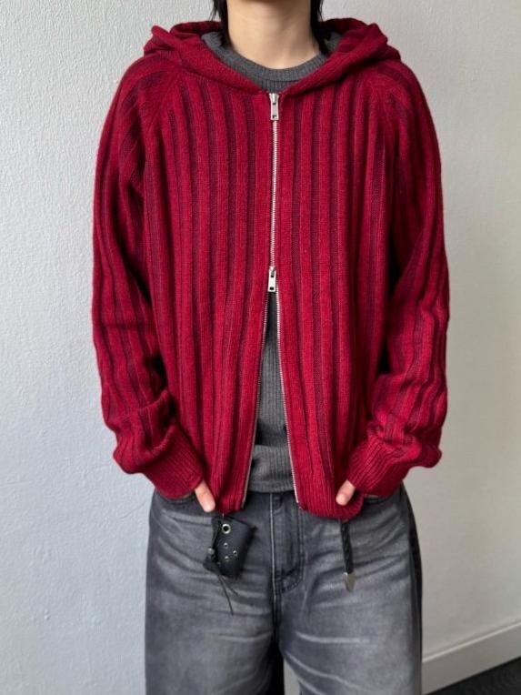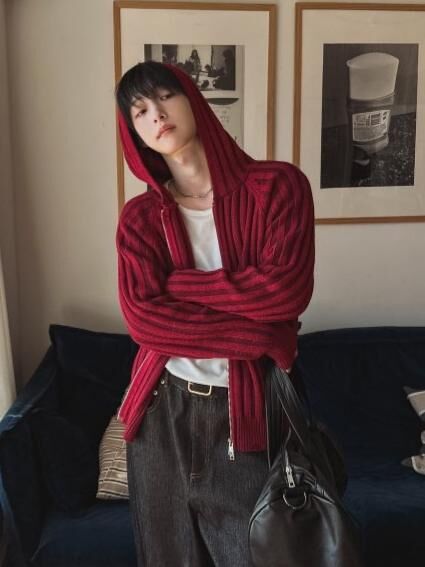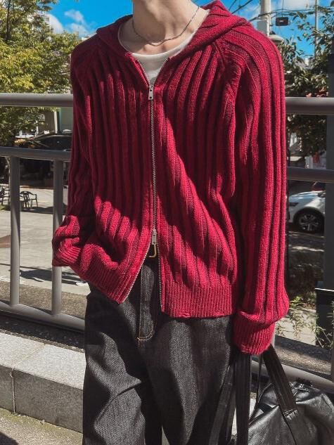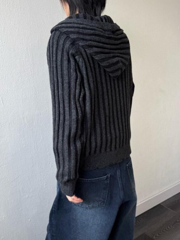 暗直紋拉鍊連帽針織外套 EARN-049JK