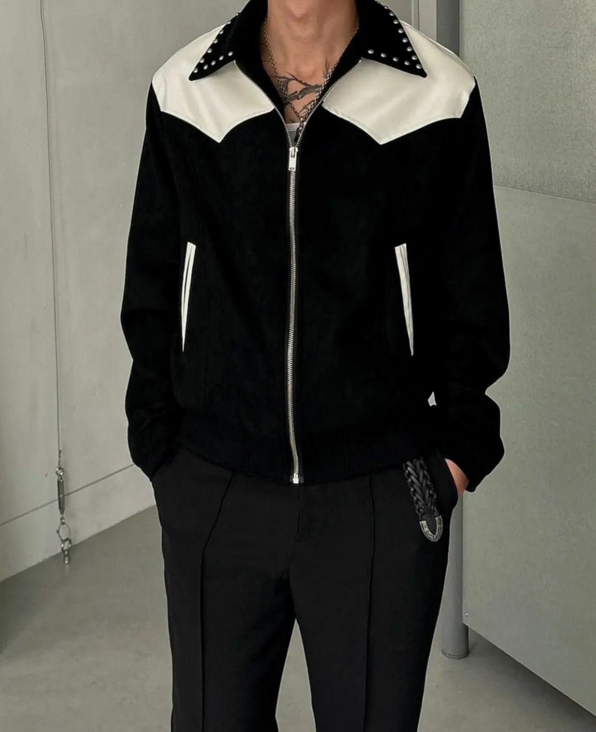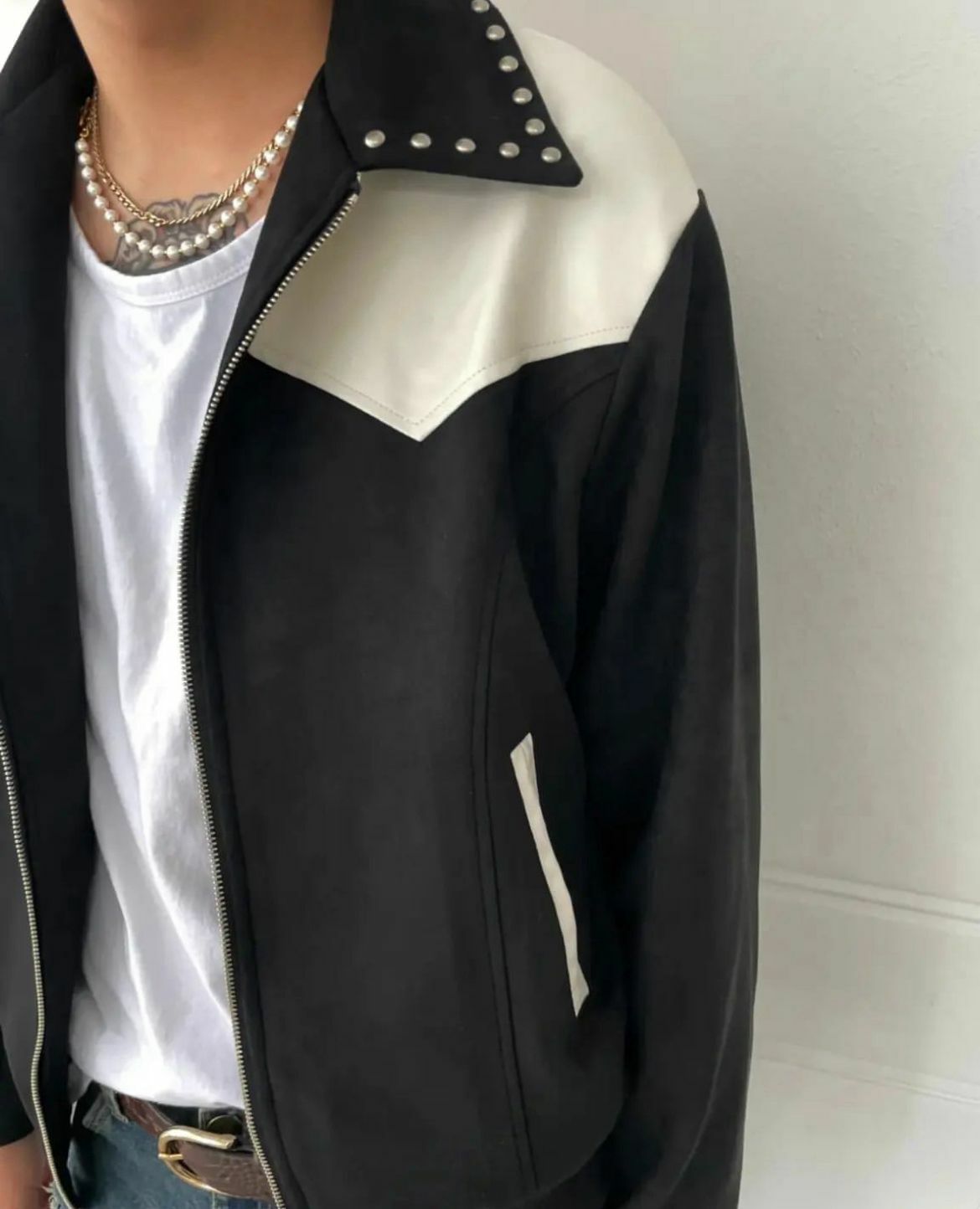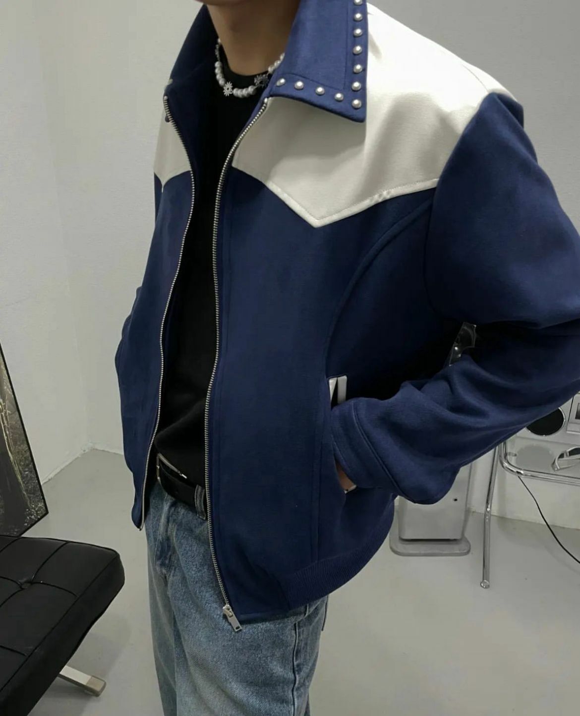 鍋釘反領猄面拼皮拉鍊外套 JK2475