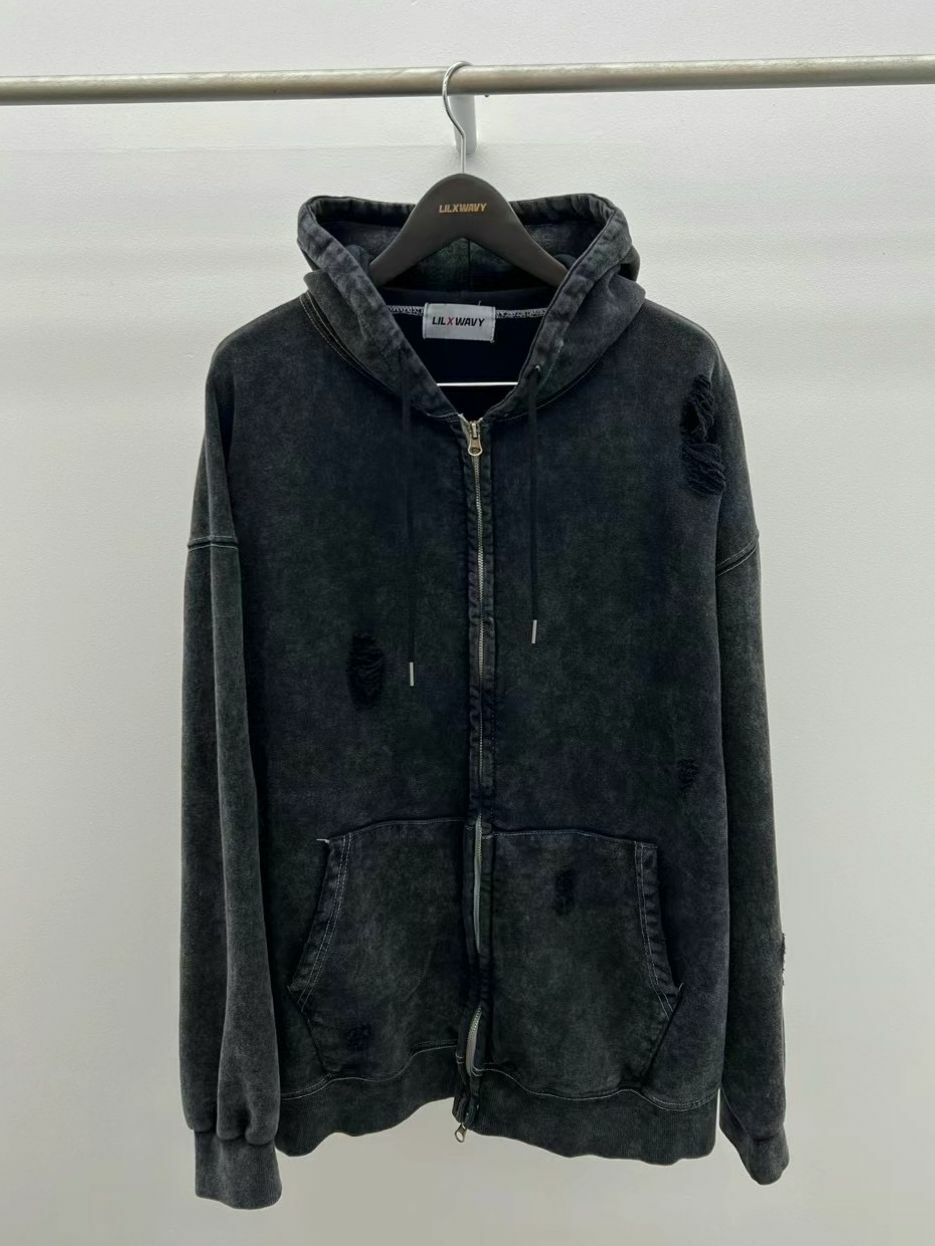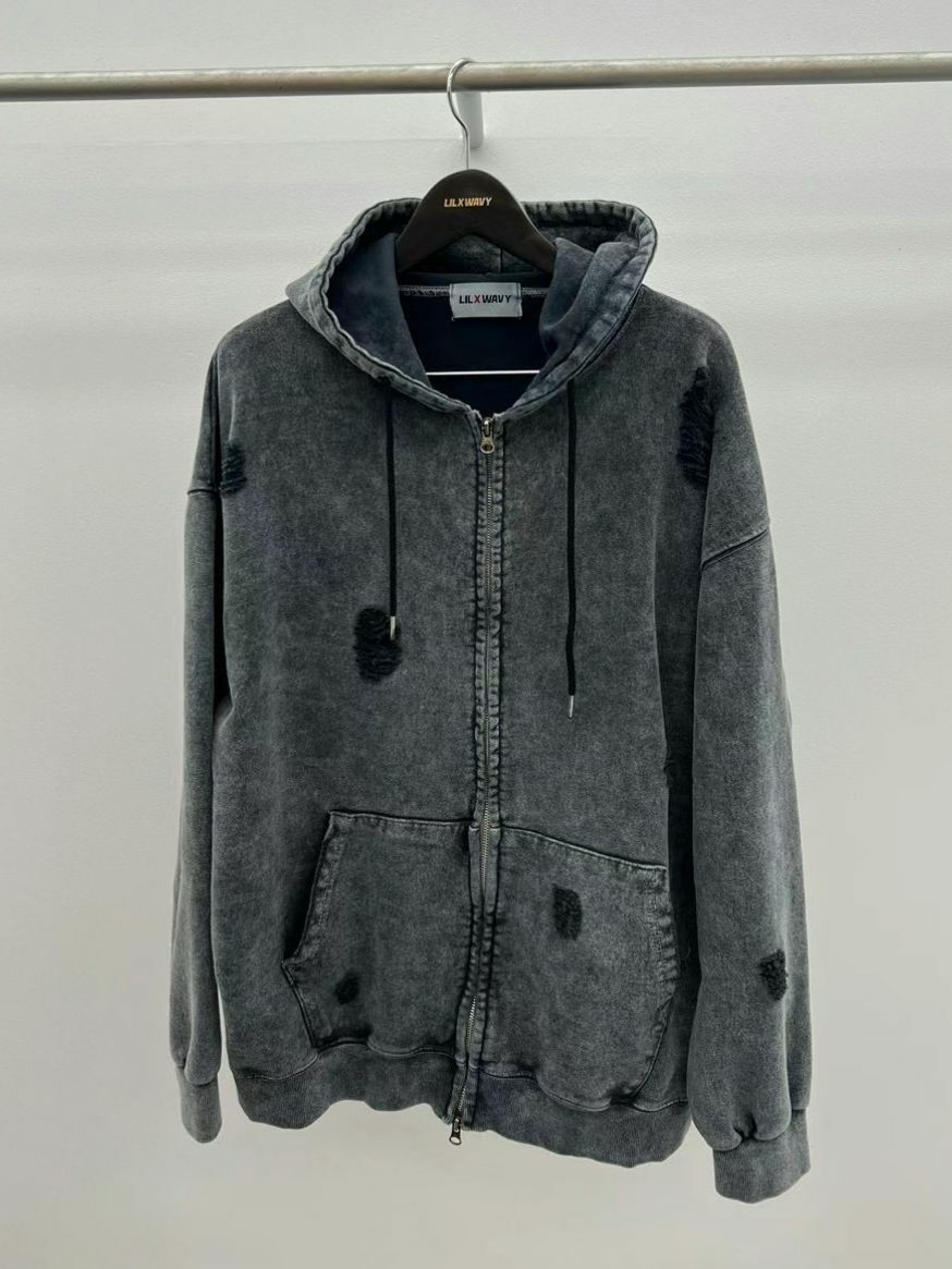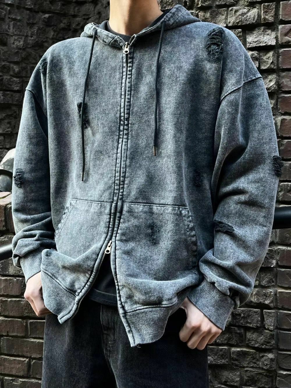 洗水破洞連帽拉鍊外套 LIL-015JK
