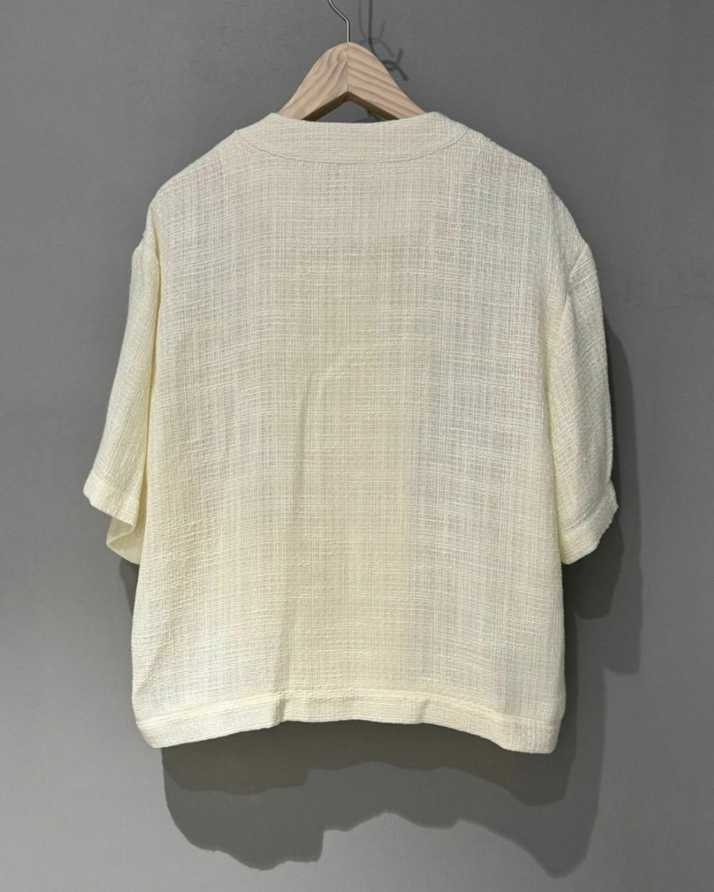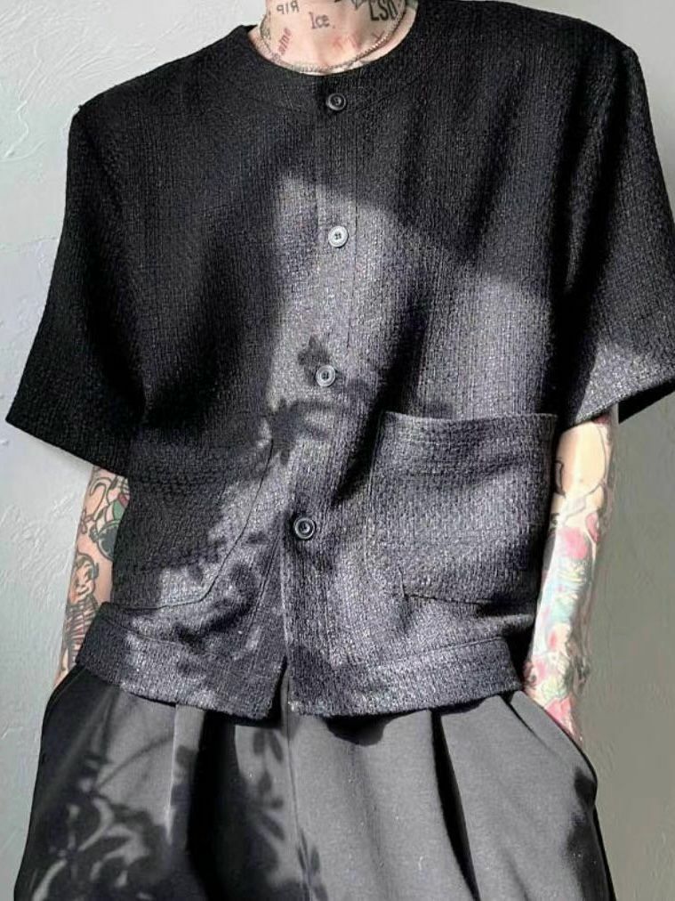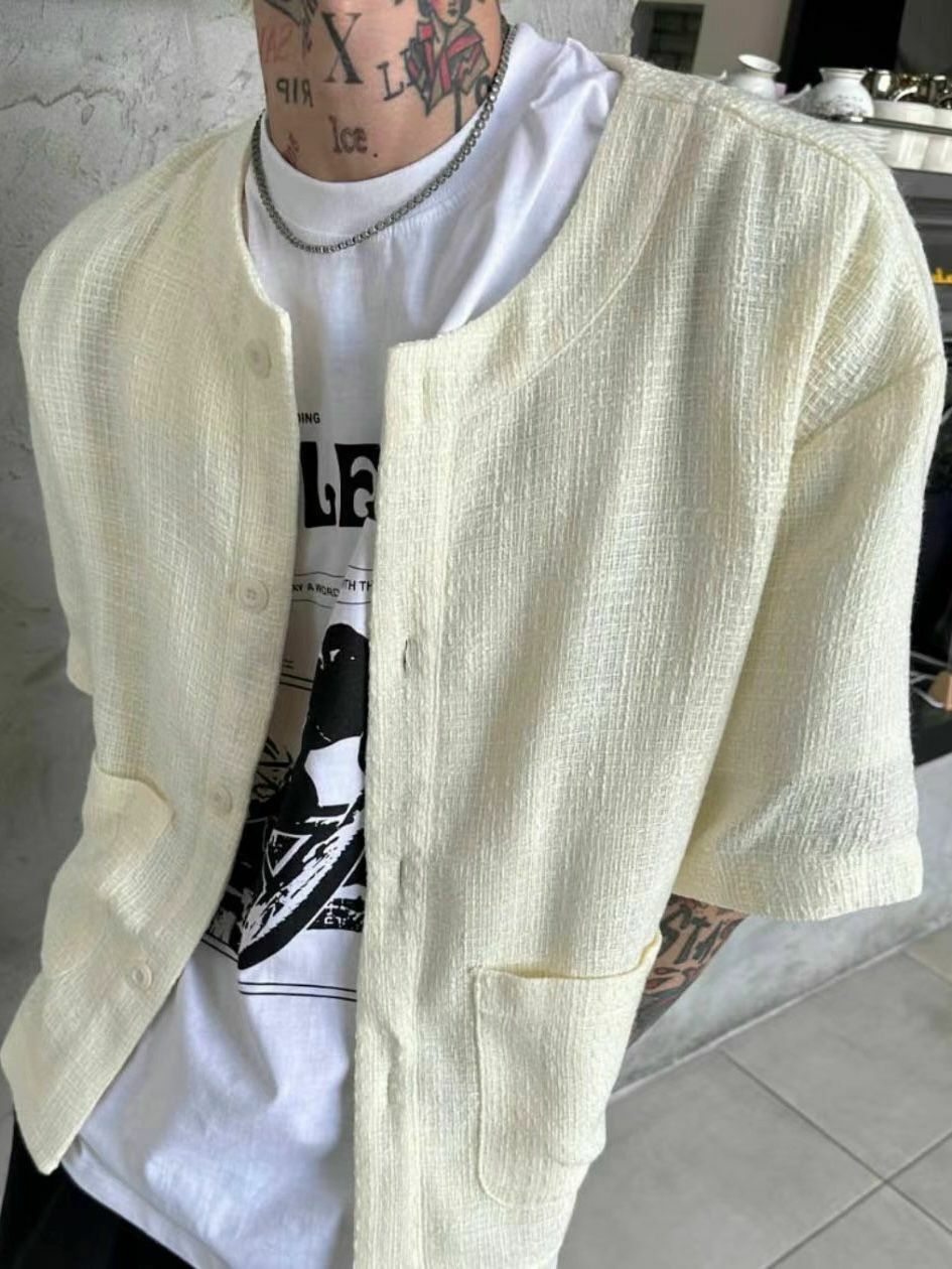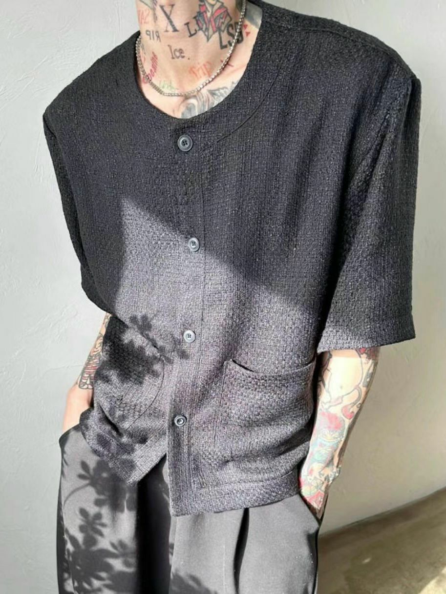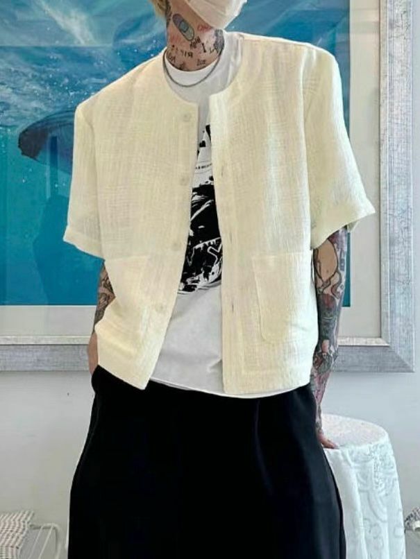 淨色圓領暗格紋開胸短袖外套 VOID-022JK